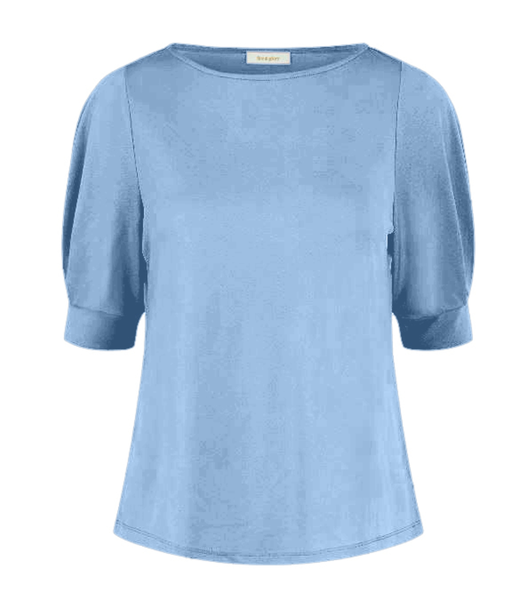 Naisten vaaleansininen trikoopaita puolipitkillä hihoilla ja korkealla pääntiellä.
