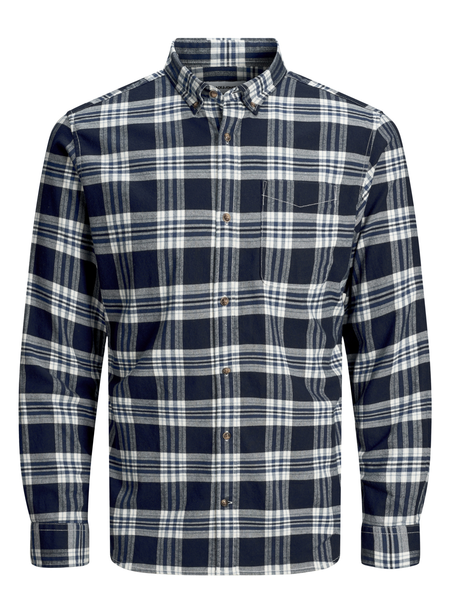 Miesten ruudullinen pitkähihainen flanellipaita, jossa väreinä tummansininen, valkoinen ja musta. Edessä tasku.