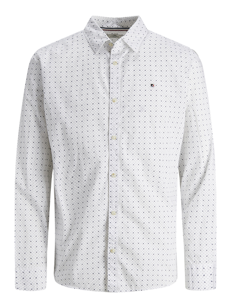 Miesten valkoinen kauluspaita, jossa pieni tumma AOP-printti.