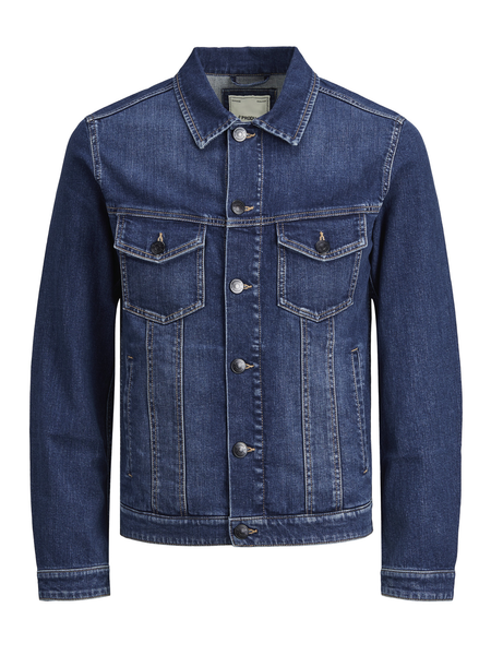 Miesten sininen farkkutakki, jossa taskut edessä ja sivuilla.