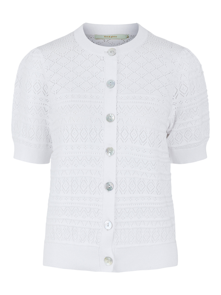 Naisten valkoinen neuletakki jossa napitus edessä, puolipitkät hihat sekä korkea pääntie. Valmistettu luomupuuvillasta.