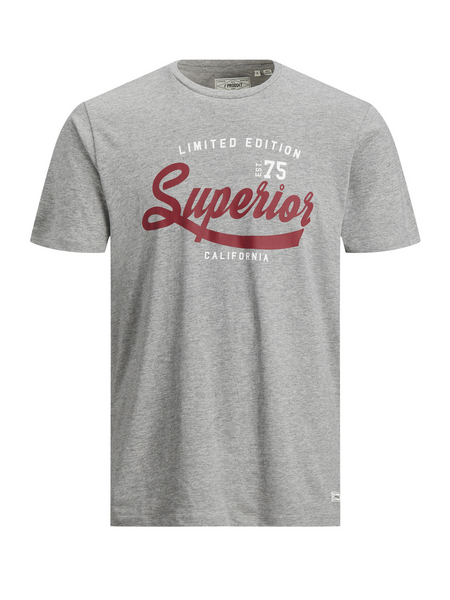 Miesten harmaa t-paita jossa suuri tekstiprintti edessä.