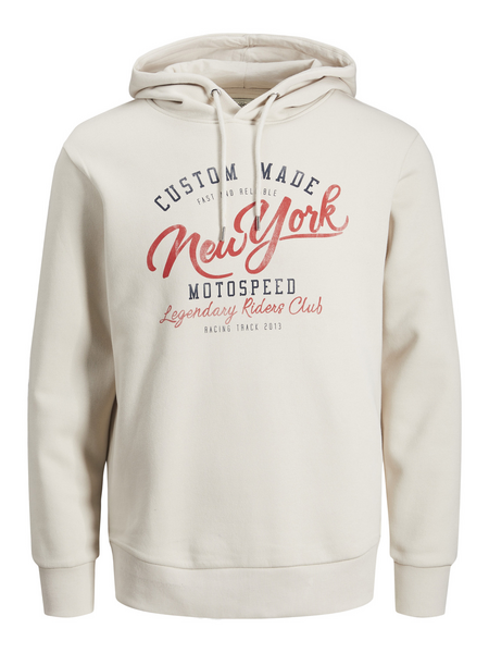 Miesten luonnonvalkoinen huppari jossa suuri tekstiprintti edessä.