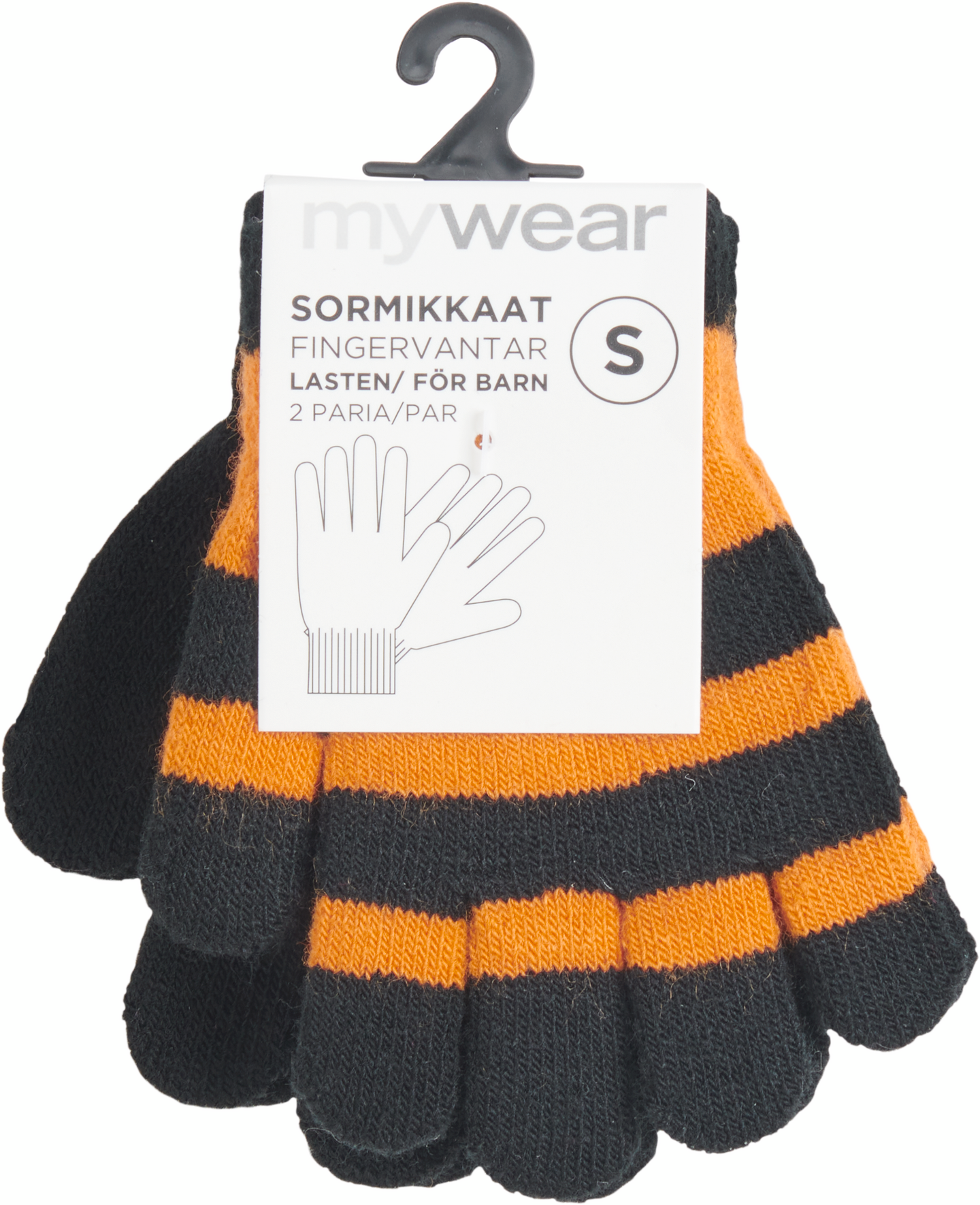 Lasten stretchsormikkaat. Pakkaus sisältää 1 parin mustia ja 1 parin raidallisia oranssi/musta värisiä sormikkaita.
