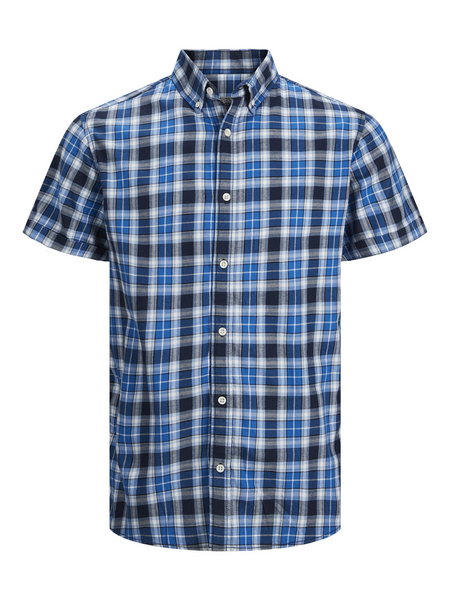 Miesten lyhythihainen ruudillinen kauluspaita jossa väreinä sininen, valkoinen ja musta.