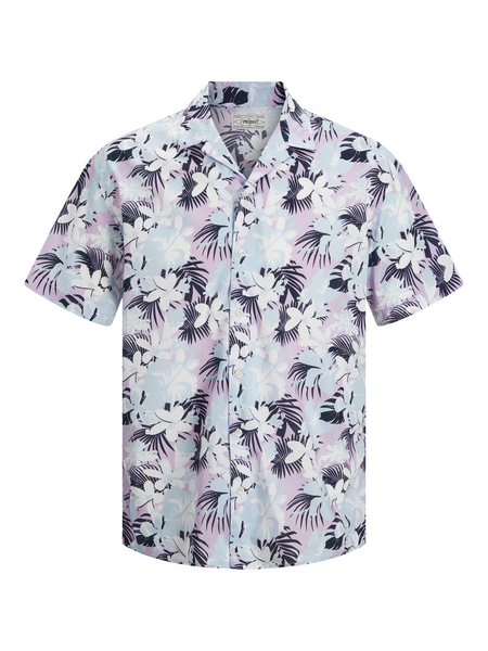Miesten violetti lyhythihainen kauluspaita jossa monivärinen kukkaprintti.