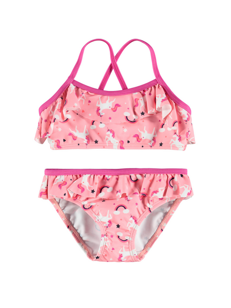 Lasten pinkit bikinit yksisarvisprintillä, yksityiskohtina röyhelöt.