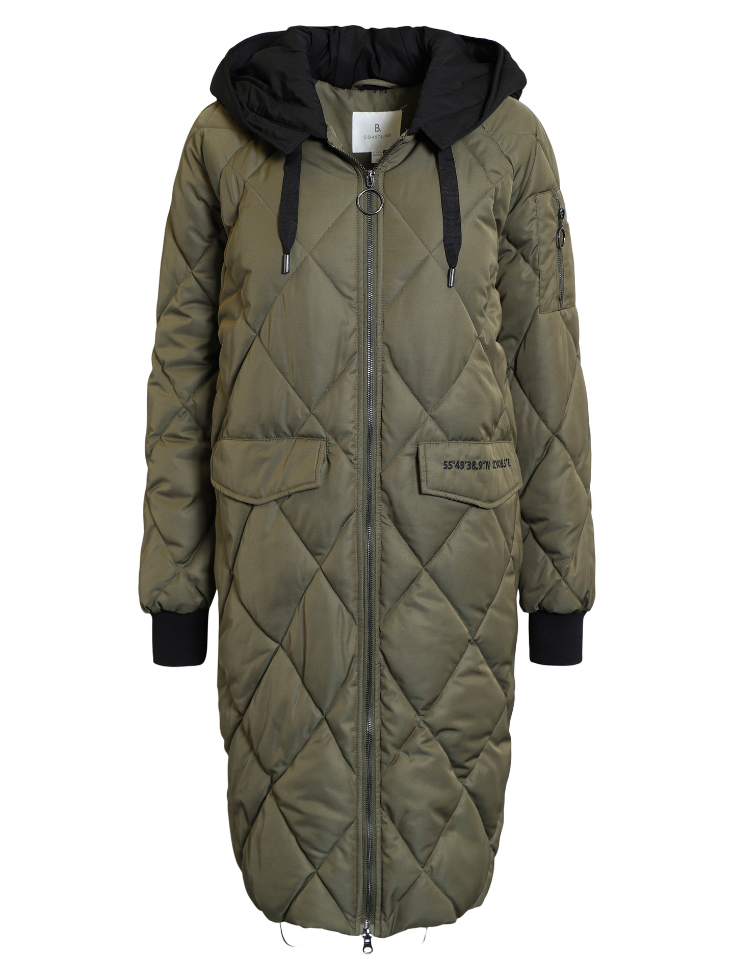 Share naisten trendikäs pitkä tikkitakki. Kiinteä huppu. Etutaskut sekä povitasku. Hihansuissa resorit.