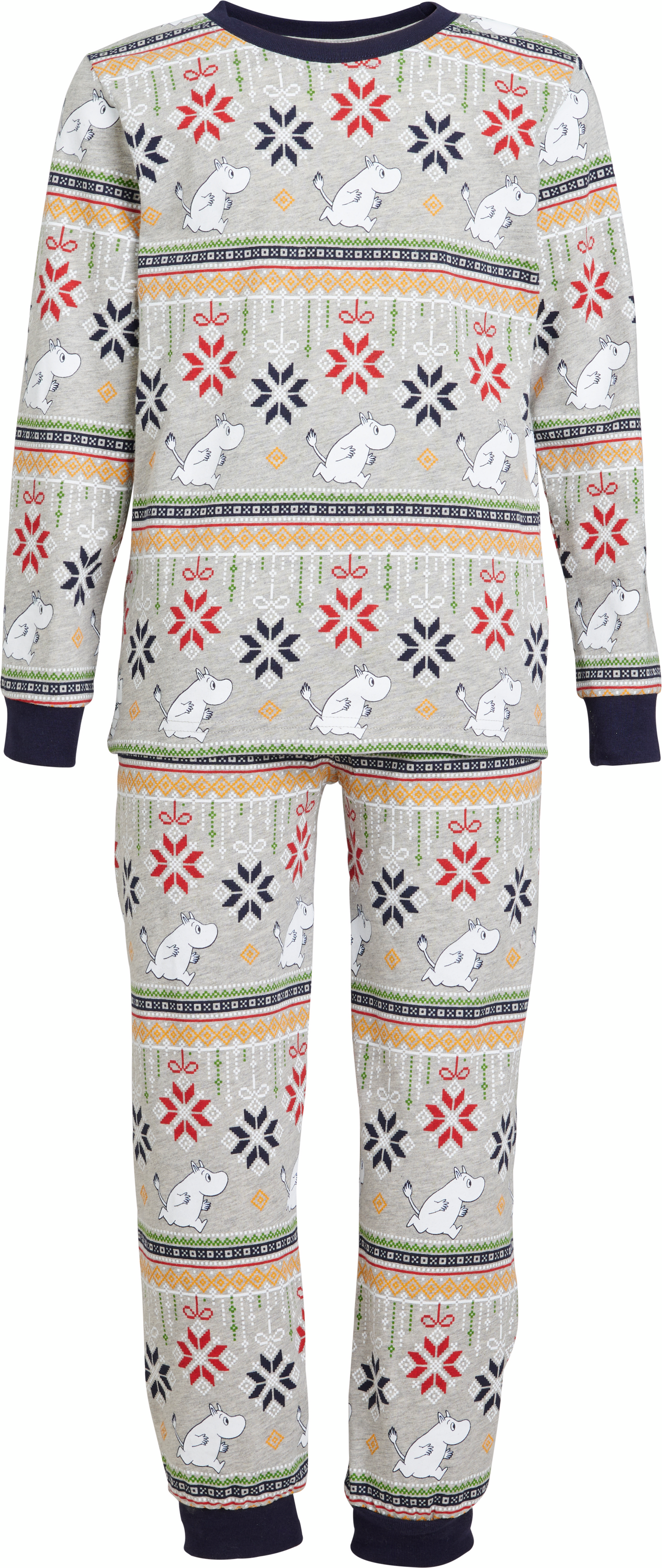 Lasten muumiaiheinen pyjama on kaksiosainen. Paidassa on pitkät hihat ja pyöreä pääntie. Housuissa on pitkät lahkeet ja joustava kuminauhavyötärö.