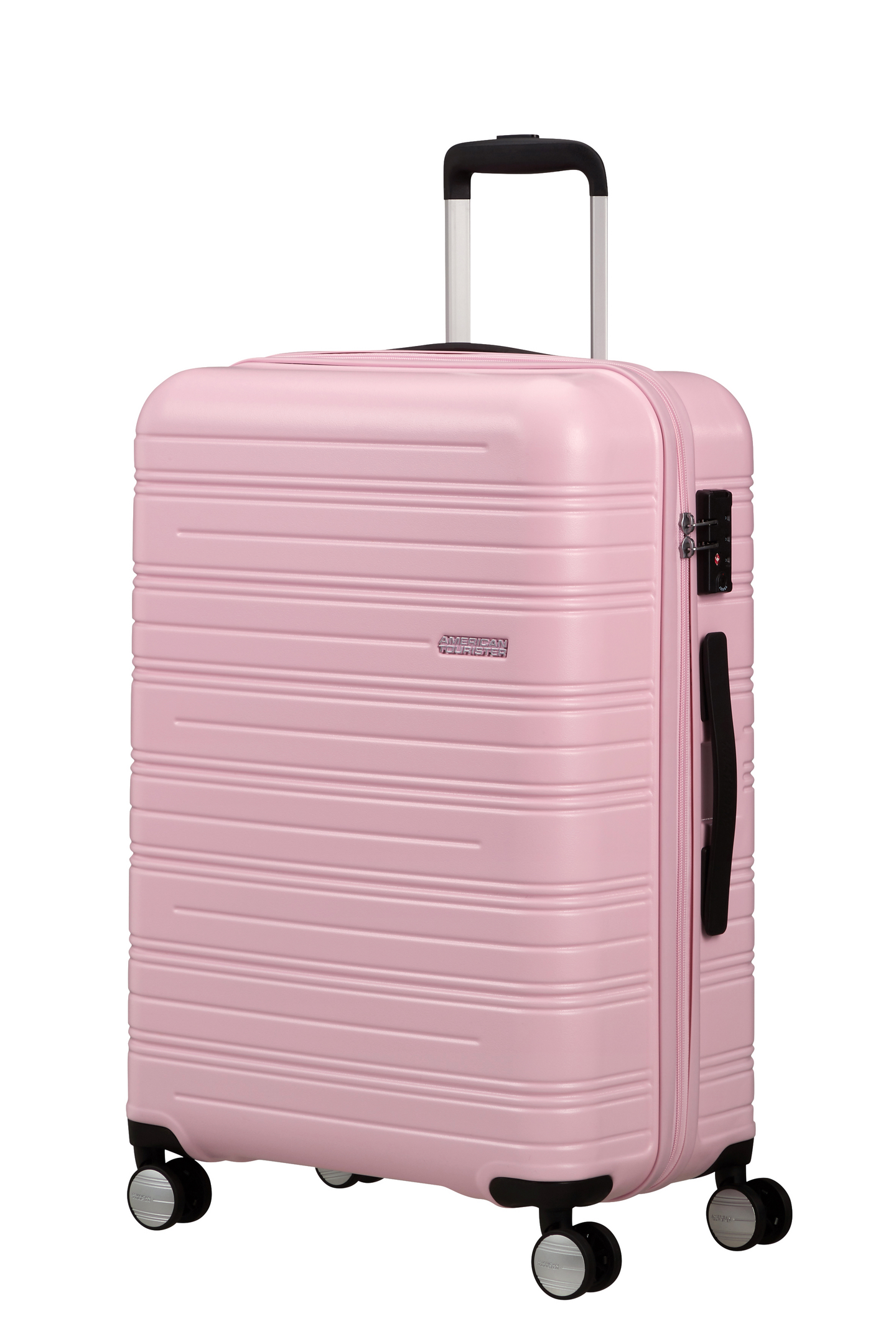 American Tourister High Turn Spinner 67 matkalaukku. Turvallinen kiinteä TSA-lukko, neljä pehmeästi liikkuvaa kaksoispyörää. Laukun sisävuori on valmistettu kierrätyistä PET pulloista valmistetusta RecyclexTM polyester kankaasta. Laukun pohjapuolella on ristikkäiseet kiristysnauhat ja päällipuolella mesh kankainen välikansi jakamassa pakkaustiloja.