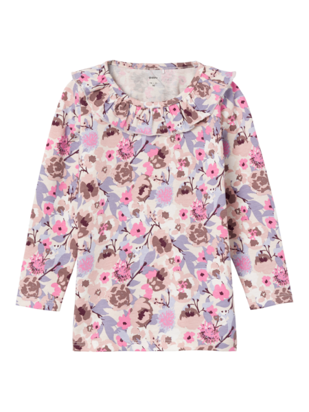 Lasten kuviollinen, pitkähihainen trikoopusero. Pyöreä pääntie jossa frilla somiste. Kankaassa kauttaaltaan toistuva kukkaprintti. Jersey on kevyttä ja joustavaa kangasta, jossa on pehmeä, miellyttävän tuntuinen sisä- ja ulkopinta.