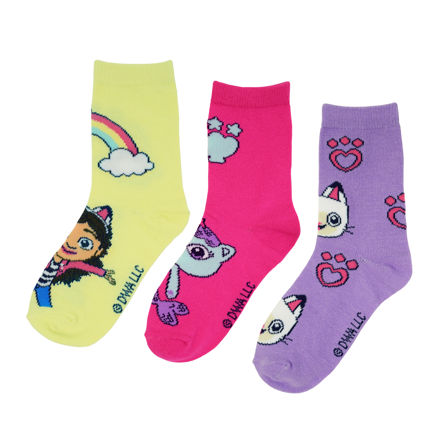 Gabby's Dollhouse 3-parin sukkapaketti sisältää keltaiset, lilat ja pinkit sukat, joissa on sarjan iki-ihanien hahmojen kuvia. Sukat on valmistettu korkealaatuisesta materiaalista – 65% puuvillaa, 33% polyesteriä ja 2% elastaania – joka tuntuu pehmeältä ja mukavalta lastesi jaloissa.