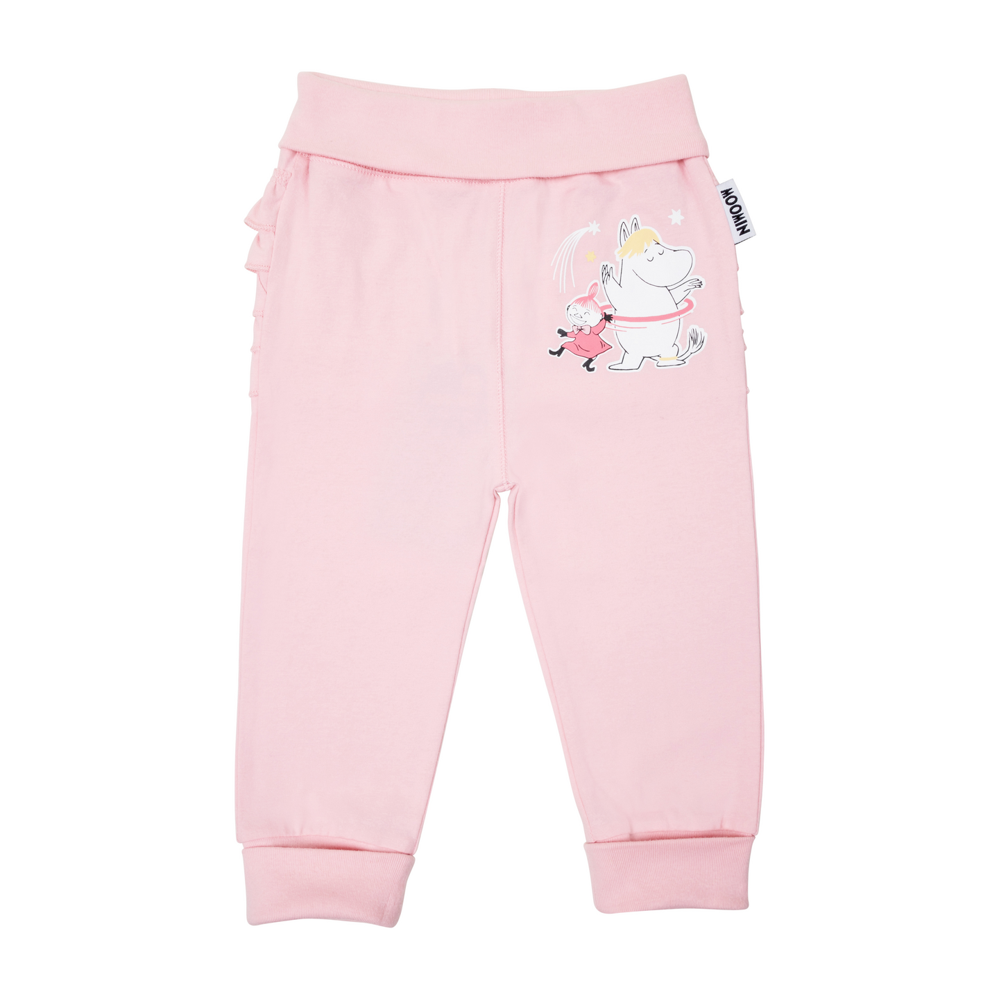 Pehmeästä kankaasta valmistetut vauvojen muumiaiheiset housut. Joustavasta kankaasta tehdyissä housuissa on käännettävät lahkeensuut ja vyötärökaitale. Takapuolen päällä on röyhelöt ja toisessa lahkeessa on hauska printti. Housujen valmistukseen on käytetty sertifioitua luomupuuvillaa.
