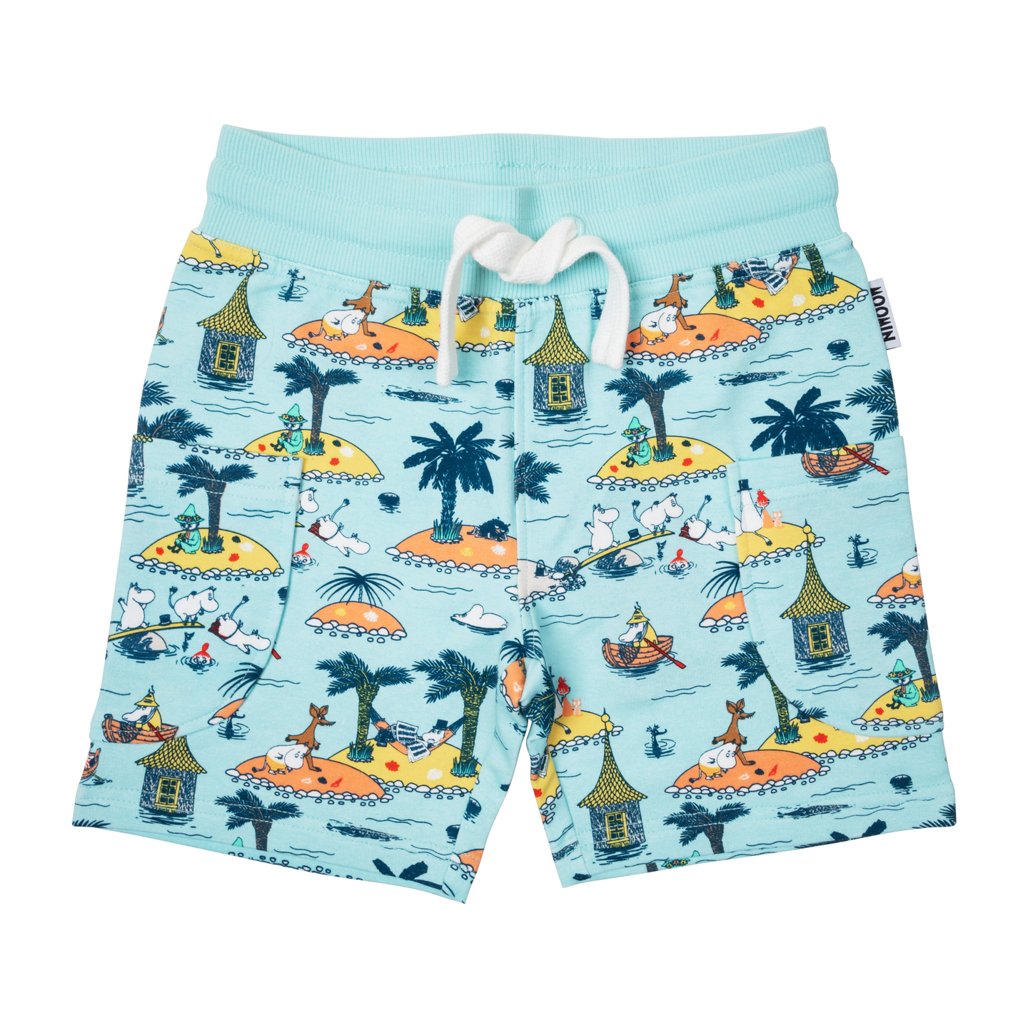 Pehmeästä kankaasta valmistetut lasten muumiaiheiset shortsit. Shortseissa on kiristysnaru vyötäröllä ja reisitaskut. Shortsien valmistukseen on käytetty sertifioitua luomupuuvillaa.