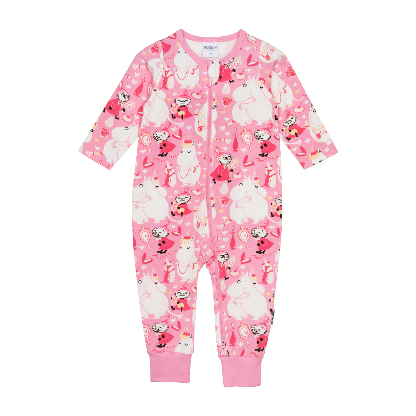 Pehmeästä kankaasta valmistettu vauvojen muumiaiheinen pyjama. Pyjamassa on pitkät hihat ja pukemista helpottava pitkä vetoketju. Pyjaman valmistukseen on käytetty sertifioitua luomupuuvillaa.