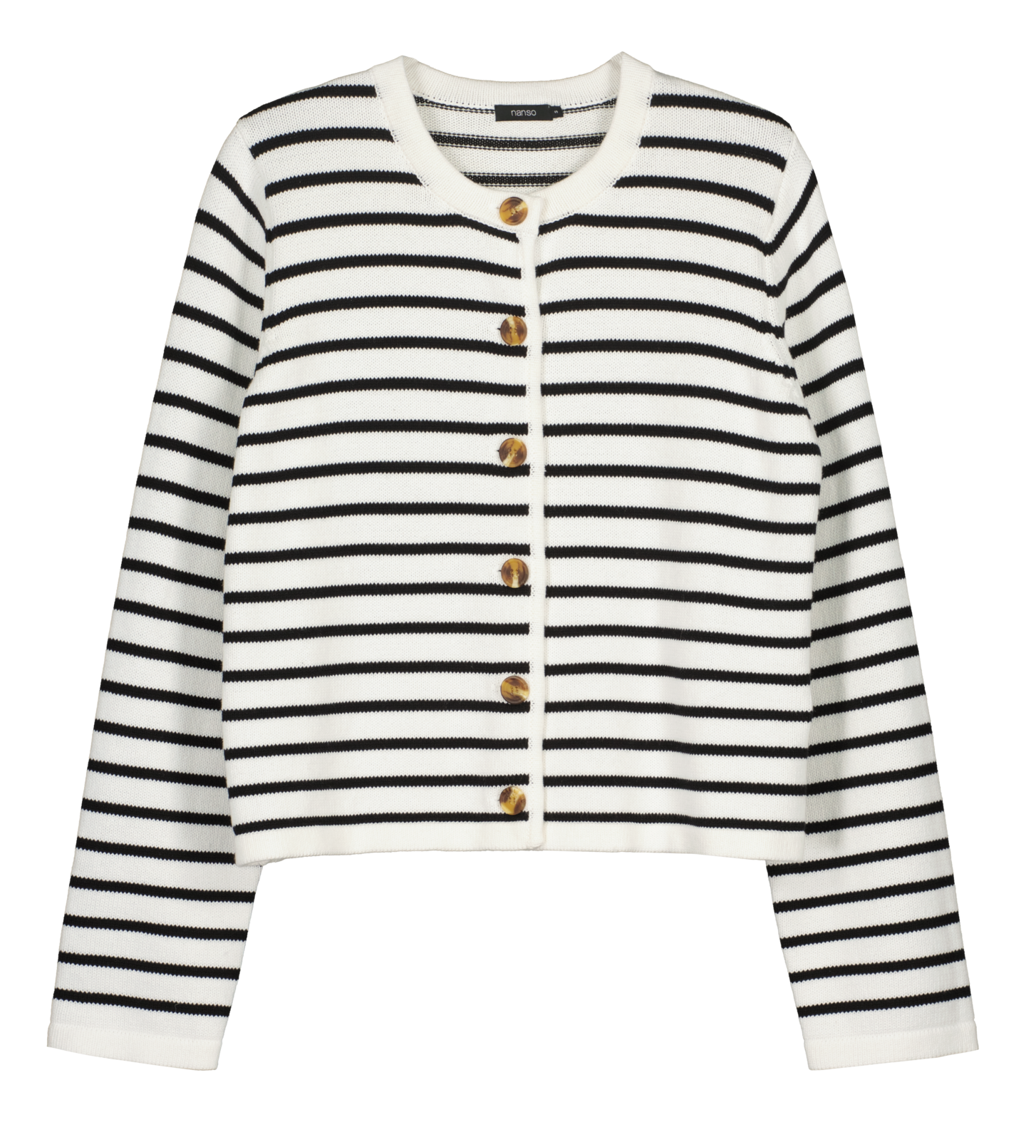 Naisten suoralinjainen Mira-neuletakki. Muotoonneulotussa puuvilla neuletakissa on pyöreä pääntie, täyspitkät hihat ja edessä napitus. Tuotteen pituus koossa M on noin 54 cm. Neuletakki on valmistettu sertifioidusta laadukkaasta puuvillasta.