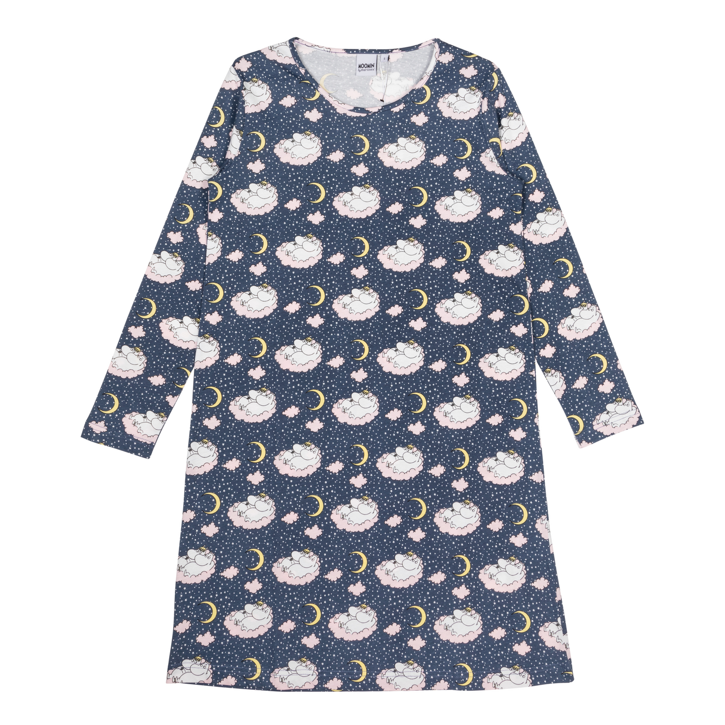 Pehmeästä puuvillasta valmistettu naisten muumiaiheinen yöpaita. Yöpaidassa on pitkät hihat ja pyöreä pääntie. Yöpaidan pituus olkapäältä helmaan koossa S on 99 cm.