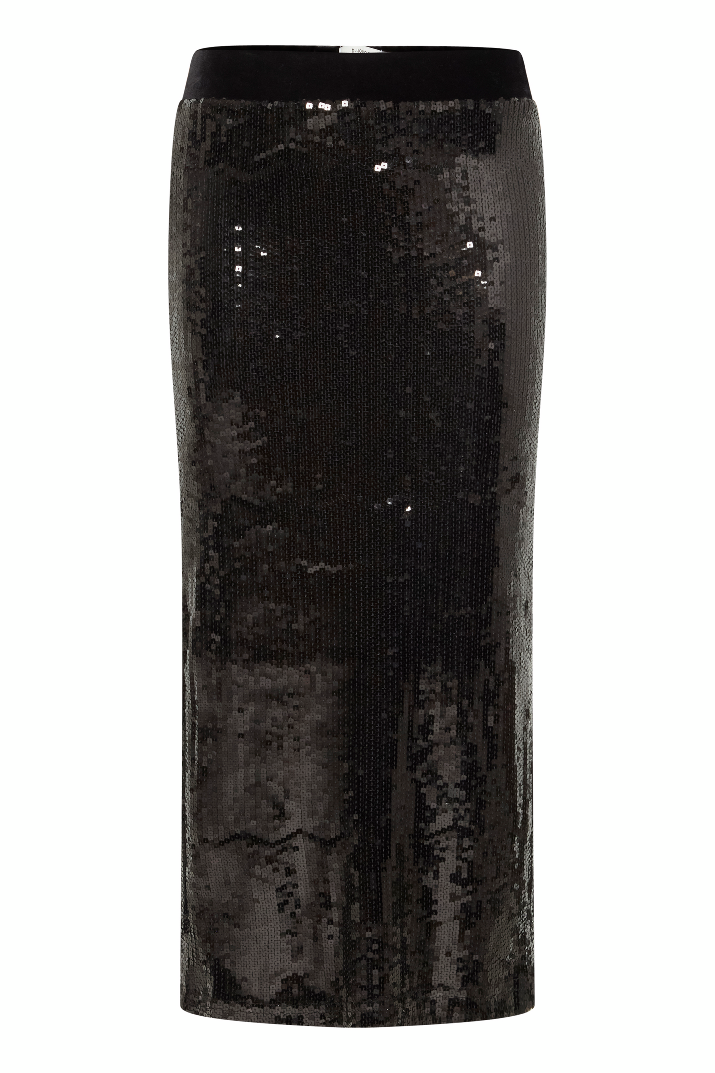 Näyttävä paljettihame, jonka pituus on sääreen saakka.