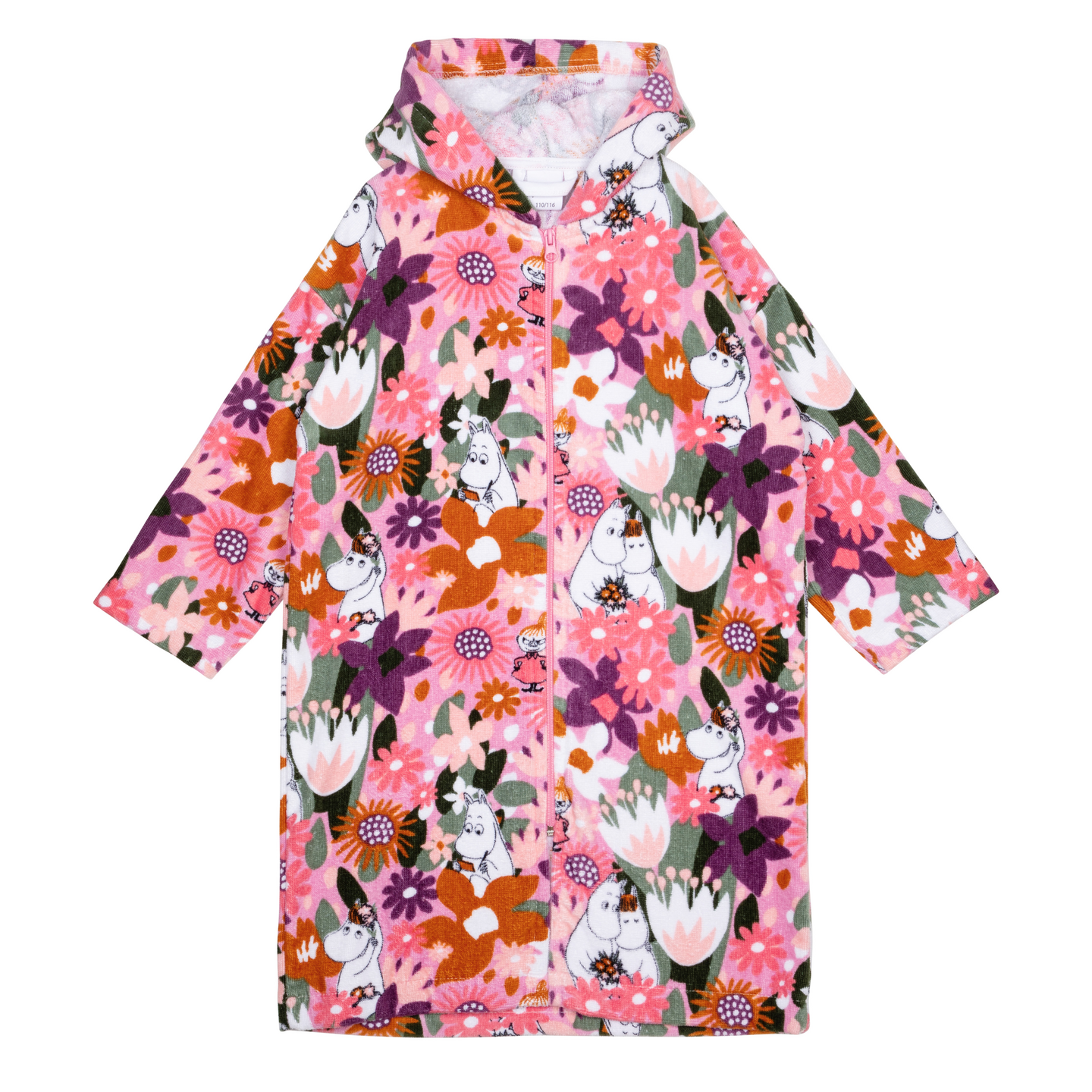 Mukavan pehmeä ja lämmin lasten muumiaiheinen kylpytakki. Kylpytakissa on huppu ja pitkät hihat. Kylpytakki suljetaan pitkällä vetoketjulla ja sen sisäpuoli on imukykyistä froteeta ja ulkopuoli pehmeää puuvillaveluuria.