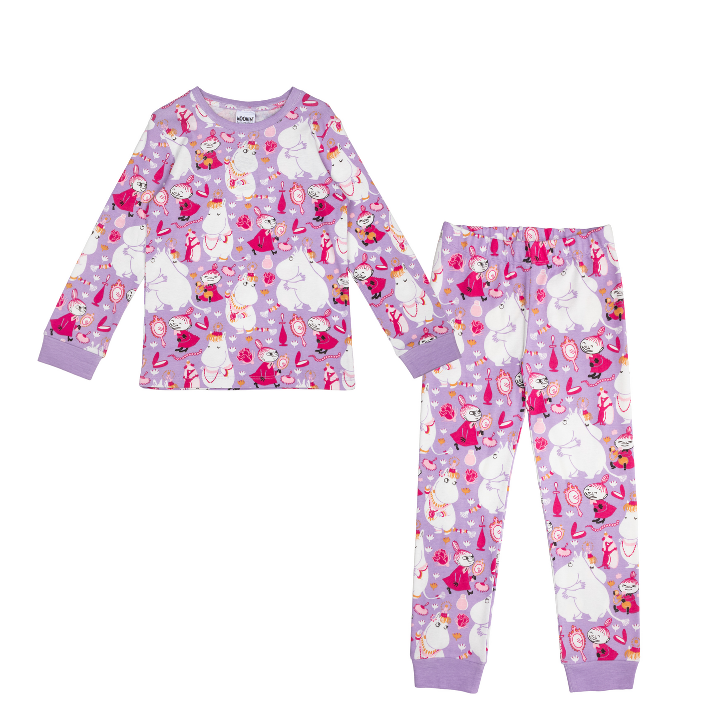Kaksiosainen lasten muumiaiheinen pyjama. Paidassa on pitkät hihat ja pyöreä pääntie. Housuissa on pitkät lahkeet ja joustava kuminauhavyötärö.
