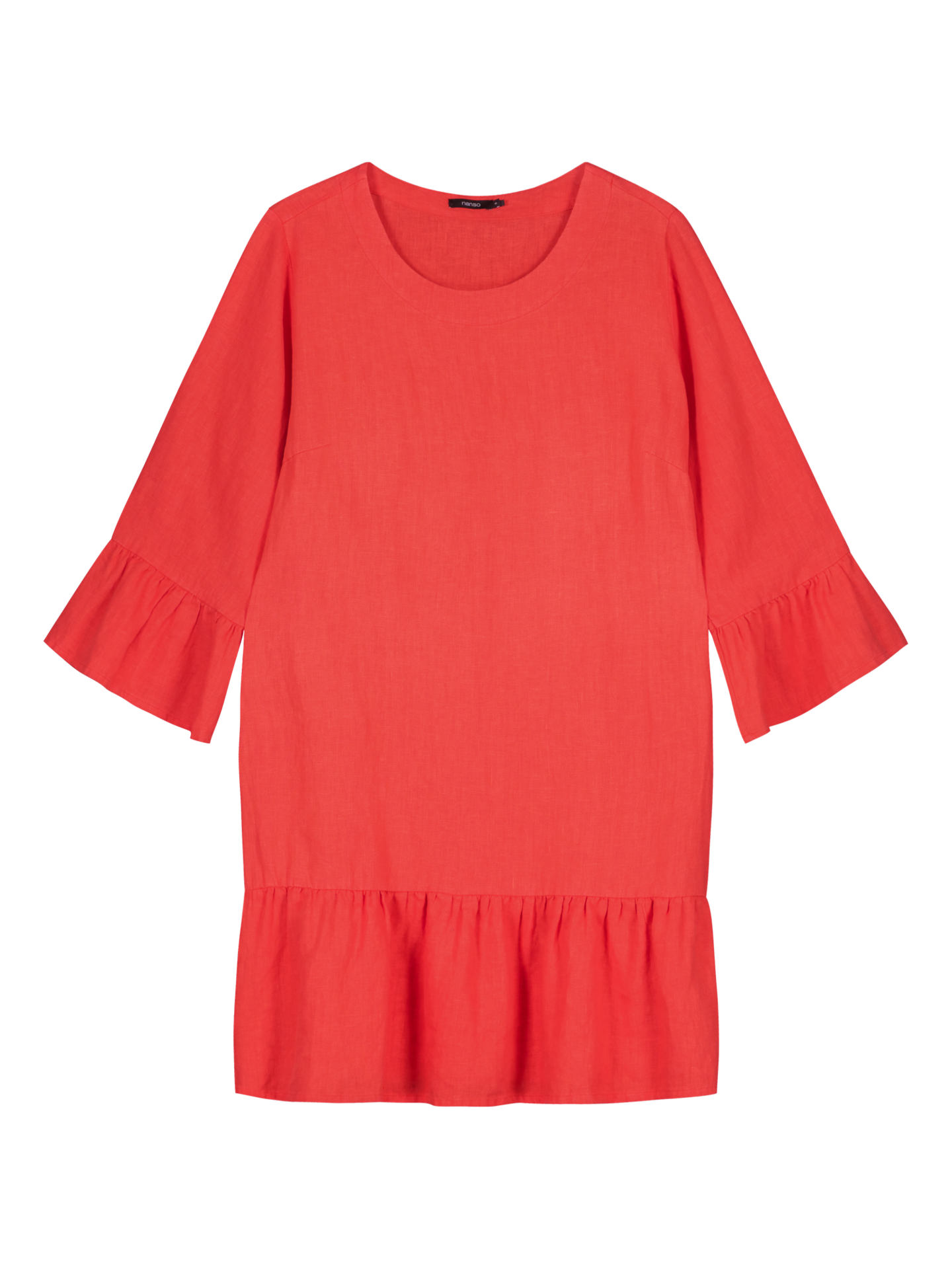 Naisten yksivärinen Liine-mekko. Rennossa väljässä pellavamekossa on alavaralla viimeistelty pyöreä pääntie ja 3/4 pituiset hihat, joissa hihansuissa poimutus. Mekon helmassa on myös poimutus ja sivuissa on taskut. Mekon pituus koossa 38 on noin 90 cm. Materiaali on kudottua pellavakangasta, joka on kestävää ja hengittävää. Pellavalle on ominaista luonnollinen pieni rypistyminen. Tuote on esipesty tuotannossa, joten se ei kutistu ensimmäisessä pesussa.