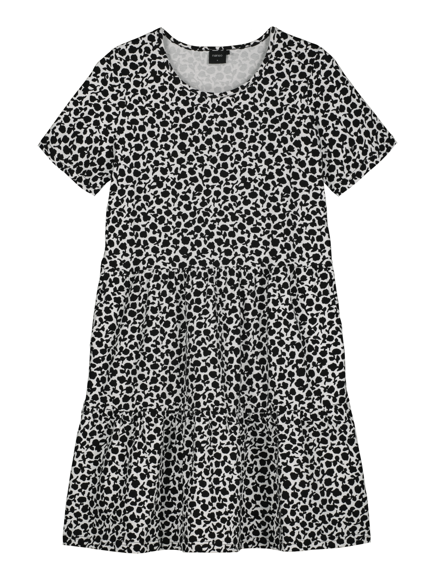 Naisten kuosillinen Kashmir-mekko. Mekossa on tereellä viimeistelty avara pyöreä pääntie ja lyhyet hihat. Mekon helma poimuttuu leikkaussaumoihin ja sivuissa on taskut. Mekon pituus koossa M on noin 95 cm. Materiaali on miellyttävän tuntuista ja helppohoitoista puuvilla-elastaani-neulosta.