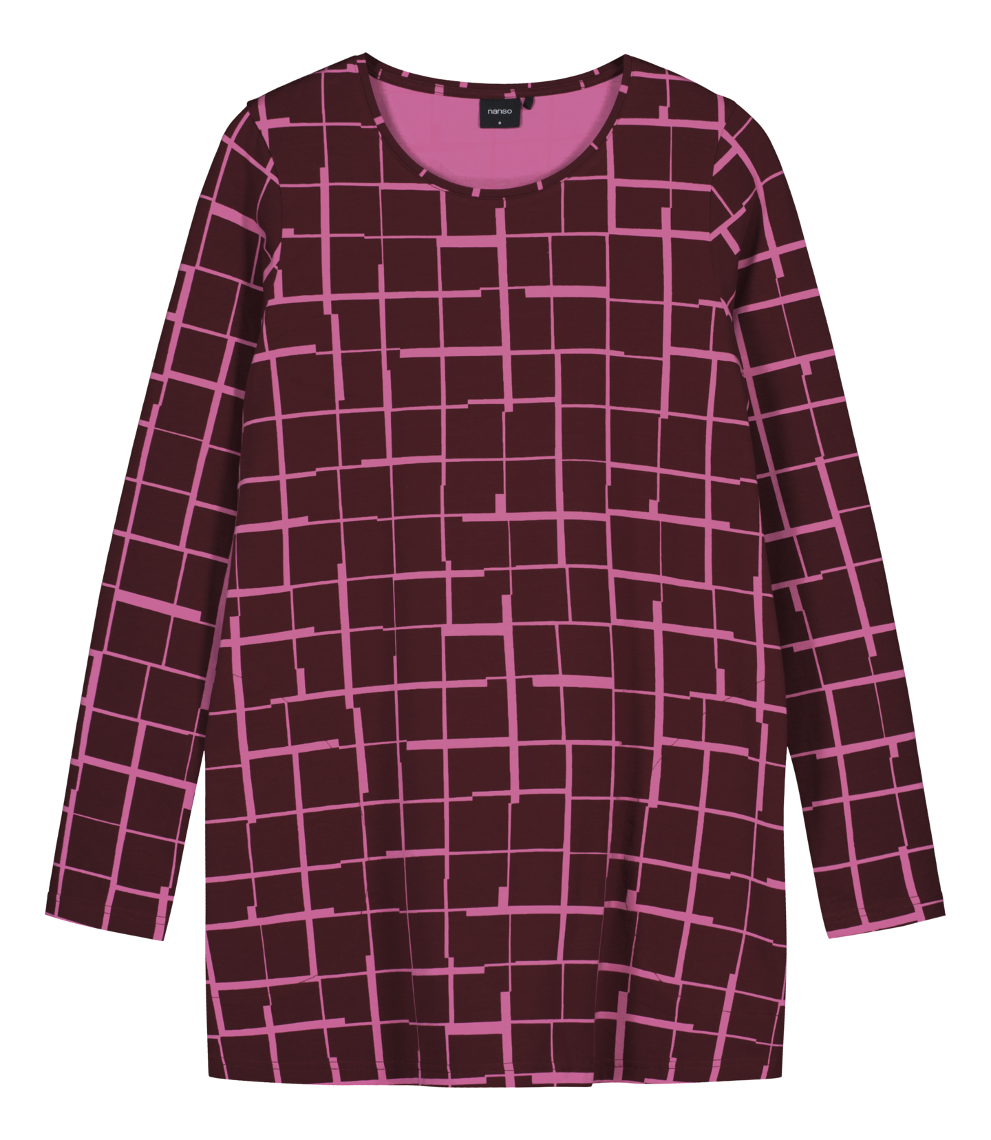 Naisten kuosillinen Tori-tunika. Tunikassa on tereellä viimeistelty pyöreä pääntie, sivuissa taskut ja täyspituiset hihat. Tunikan pituus koossa M on noin 80 cm. Materiaali on miellyttävän tuntuista ja helppohoitoista puuvilla-elastaani-neulosta.