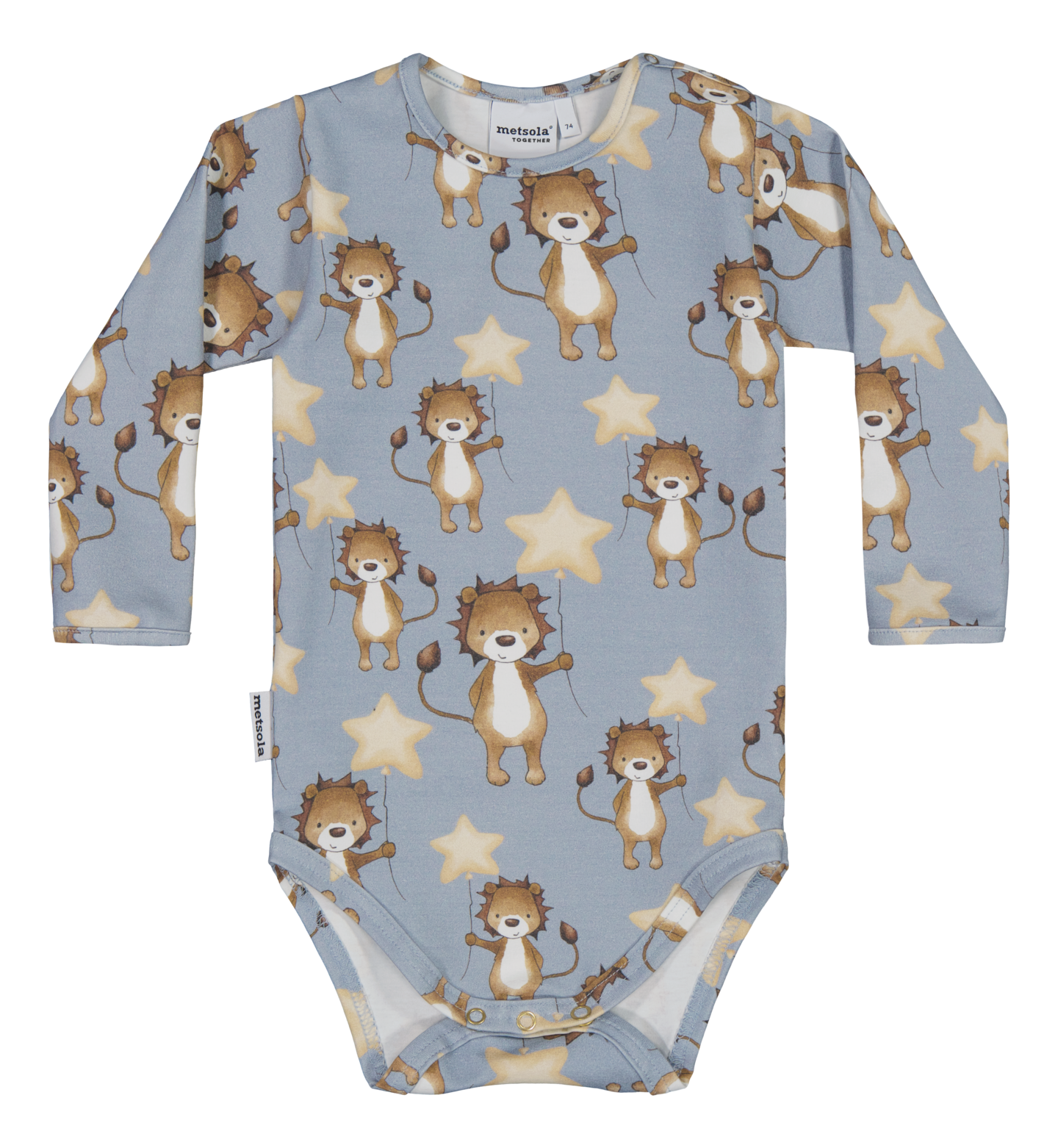 Ihastuttava Lucky Lions- vauvan body yhdistää pehmeän materiaalin ja suloisen kuosin! Kuosin on suunnitellut Henna Adel. Body on valmistettu pehmeästä luomupuuvillasta, joka on hellä vauvan iholle ja hengittää hyvin. Nepparit olkapäällä ja haarassa tekevät pukemisesta helppoa. Materiaali on joustavaa, mikä takaa vauvan vapaan liikkumisen. Tuotteessa on pitkät hihat ja kuosin kohdistus on ainutlaatuinen jokaisessa tuotteessa. Tuotteen kangas on valmistettu Öko-tex-sertifioiduista puuvillalangoista.