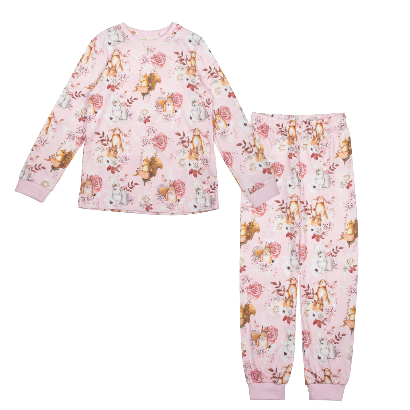 Kauniisti kuvioidusta pehmeästä kankaasta valmistettu lasten kaksiosainen pyjama. Paidassa on pitkät hihat ja pyöreä pääntie. Pitkälahkeisten housujen vyötäröllä on joustava kuminauha. Pyjaman valmistukseen on käytetty sertifioitua luomupuuvillaa.