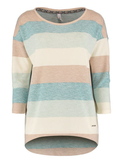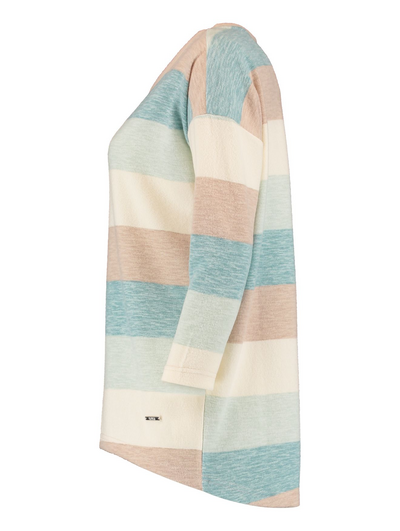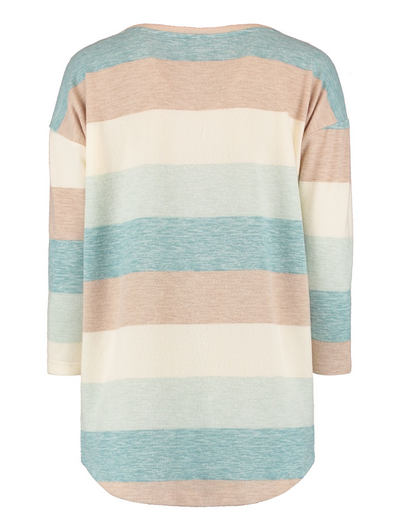 Pehmeä ,suosittu trikoopusero nyt khaki /beige/valk raitakuosissa. Takaa pidempi ja aavistuksen puolipitkä hihat. Väljä malli ,joka sopii kaikille vartalotyypeille.
