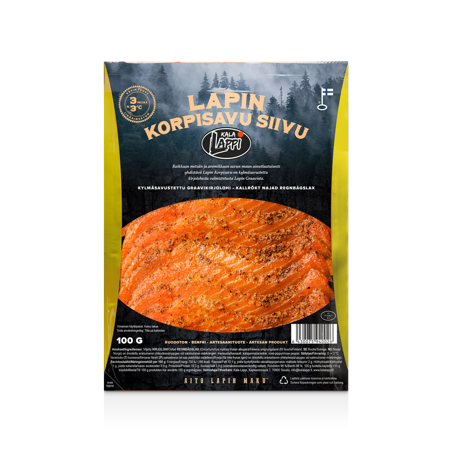 Raikkaan metsän ja aromikkaan savun maun ainutlaatuisesti yhdistävä Lapin Korpisavu on kylmäsavustettu tuoreesta kirjolohifileestä valmistetusta Lapin Graavista. 100 g tuotetta on käytetty 155 g kirjolohifileetä.