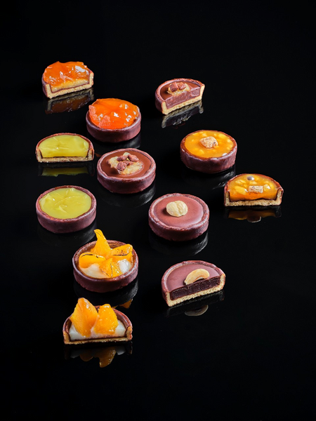 Herkullinen vegaaninen täytetty tartaletti lajitelma "petit fours"-koossa . Lajitelmassa kuusi erilaista makuyhdistelmää: Karamelli-manteli, Sitruuna, Päärynä-suklaa, Omena-vanilja, Suklaa praliini ja Persikka.