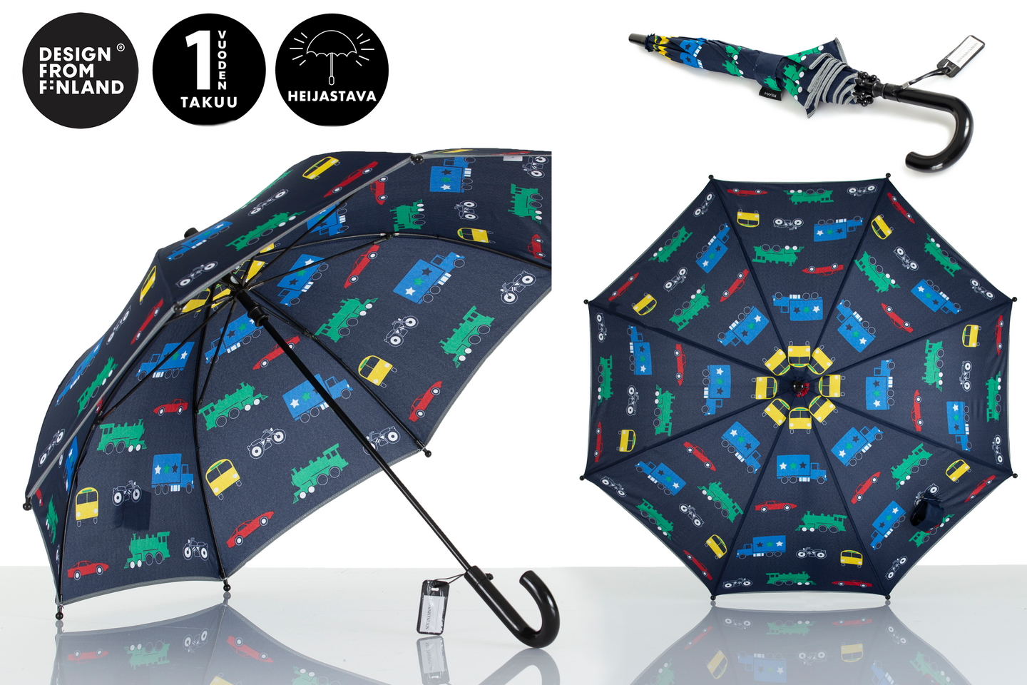 Lasten laadukas ja turvallinen sateenvarjo 3M heijastinnauhalla, Design From Finland, varjon pituus 61cm, avattuna halkaisija 74cm, sport-kuosi sinisellä pohjalla.
