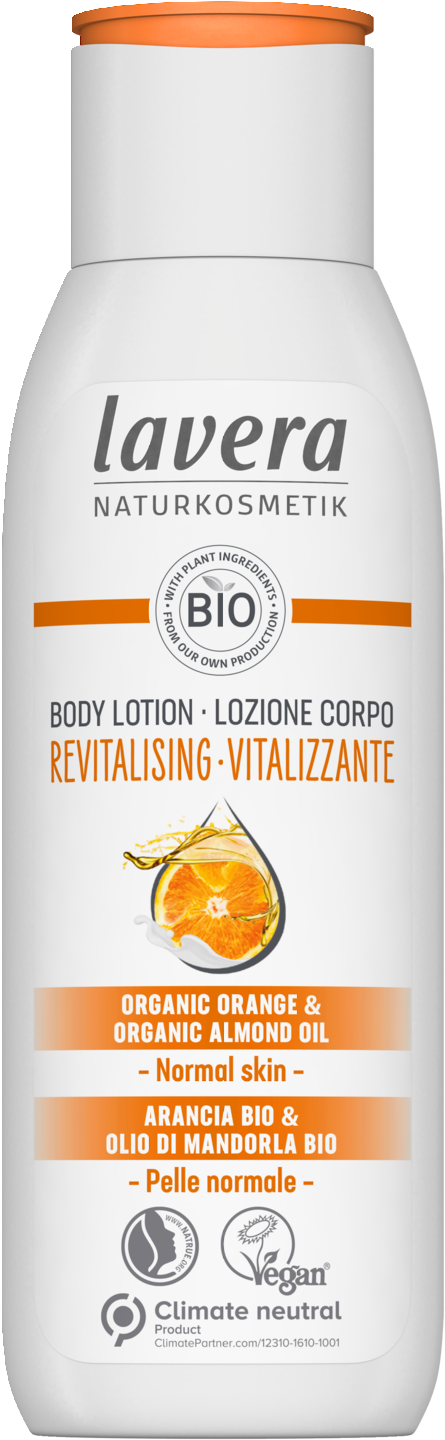 Luomuappelsiinia ja luomumanteliöljyä sisältävä vartalovoide ravitsee ja elvyttää ihoa hellävaraisesti. Kevyt koostumus imeytyy nopeasti ja tarjoaa intensiivistä ja pitkäkestoista kosteutta. Manteliöljy ravitsee ihoa ja auttaa ihoa ylläpitämään kosteustasapainoa. Raikas, hedelmäinen appelsiinin tuoksu herättää aistit. lavera Revitalising vartalovoide on Natrue -sertifioitu, dermatologisesti testattu ja hiilineutraali tuote. Pullo on valmistettu 100% kierrätysmateriaalista ja koostumus on biohajoava. Vartalovoide on vegaaninen ja sillä on Peta-sertifikaatti.