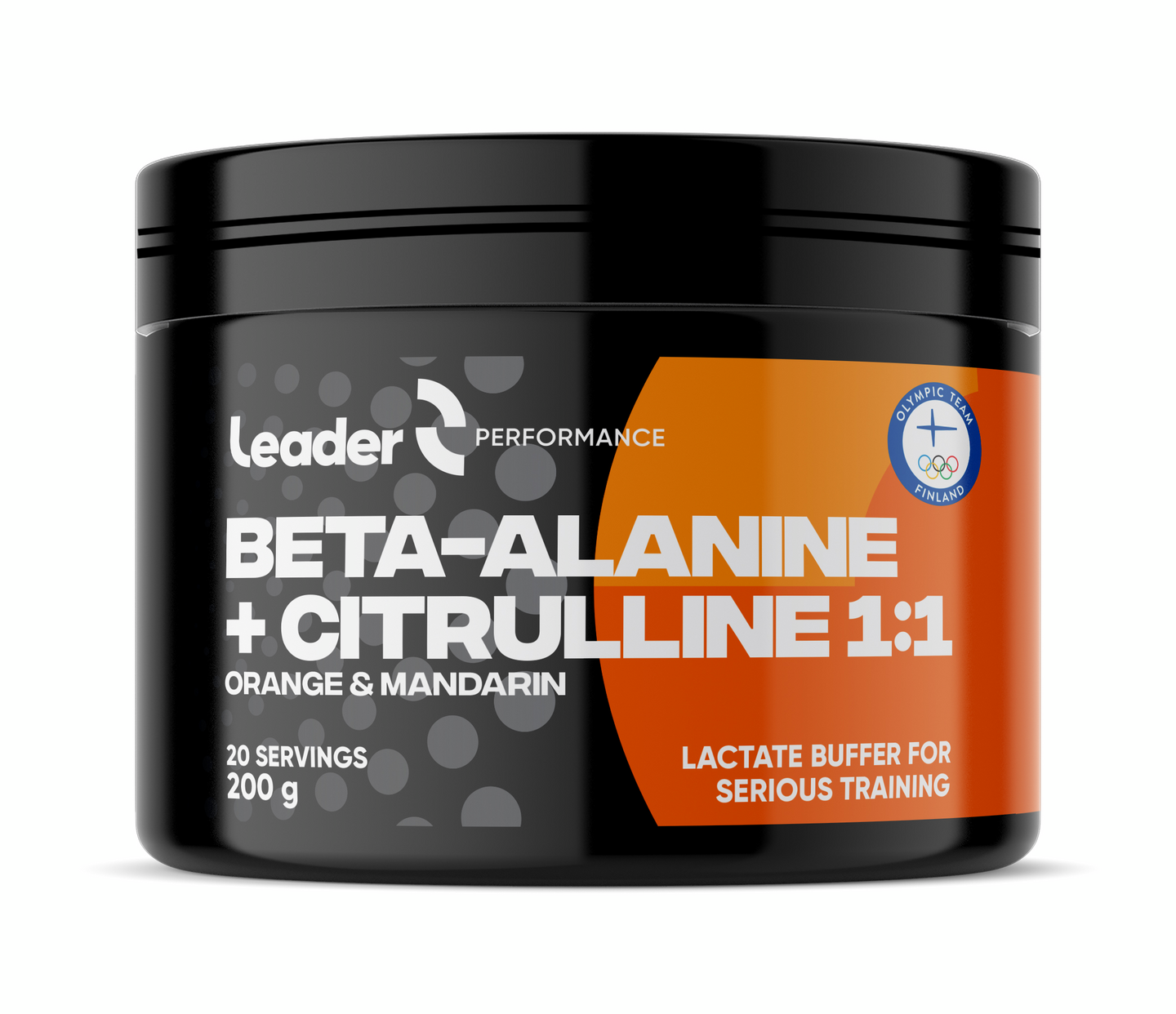 Leader Performance Beta-alanine + Citrulline 1:1 on tuplavaikutteinen tehonlisääjä. Beta-alaniini toimii laktaattipuskurina kovatehoisen treenin aikana. Tuotteessa oleva sitrulliinimalaatti osallistuu verisuonten toimintaan muun muassa lihaksissa. Auttaa viemään suoritusta pidemmälle. Kehitetty ja valmistettu Suomessa.