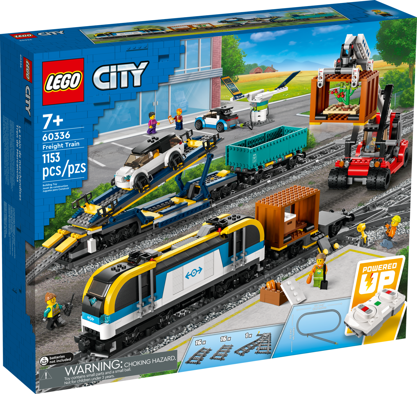 Täältä saapuu LEGO® City Tavarajuna tehokkaan veturin vetämänä. 3 mahtavaa junavaunua on valmiina kuljettamaan kaikenlaista lastia. Aja kurottaja kyytiin ja lastaa avotavaravaunuun 2 säiliötä, joissa on kasveja ja säilykkeitä, ja nosta avovaunun kyytiin sähköautojen latausasema. Laske autonkuljetusvaunun alempi taso, aja 2 sähköautoa kyytiin ja kiinnitä ne tiukasti. Juna on valmiina lähtöön aikataulun mukaisesti!