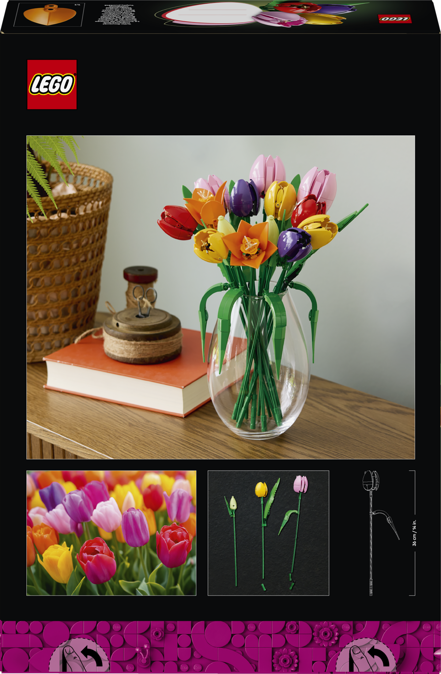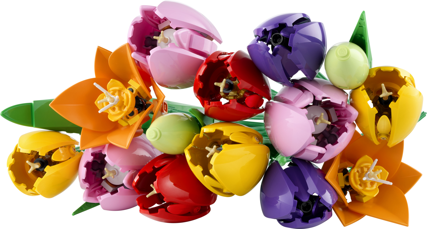 LEGO kukkakimppu ilmentää kevään iloa ja optimismia. Siinä on 5 eriväristä tulppaania kukinnan eri vaiheissa. Rakenna vihreitä silmuja, violetteja nuppuja, täyteen kukkaan puhjenneita punaisia, keltaisia ja vaaleanpunaisia tulppaaneja sekä aitouden tuntua tuovia vihreitä lehtiä. Kukka-aiheinen rakennussetti sisältää myös säädettävät varret, joiden ansiosta tulppaaneista voi sommitella persoonallisen LEGO kukkakimpun. Hauskan rakennusprojektin lopputuloksena on upea kukkakoriste, joka tuo väriä sisustukseen.