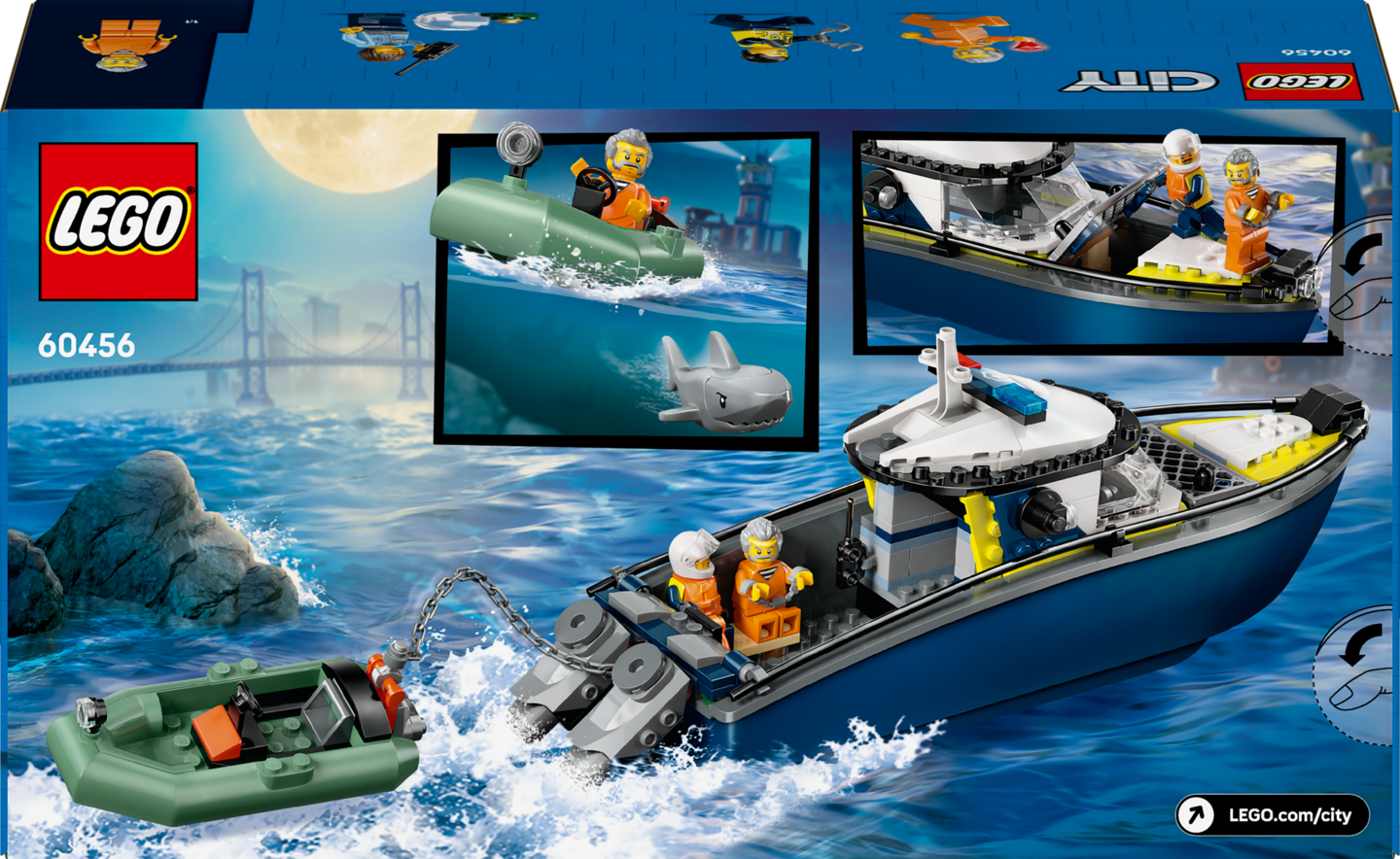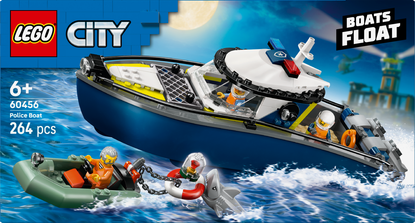 Arjen sankarit tulevat ihastumaan tähän LEGO® City Takaa-ajo poliisiveneellä (60456) lelusettiin. Setti sopii täydellisesti 6 vuotta täyttäneille rakentajille, ja se sisältää lelupoliisiveneen, jossa on kaksi perämoottoria ja pidätysselli, sekä roiston moottoriveneen. Molemmat veneet kelluvat vedessä, ja lapset voivat sukeltaa jännittäviin poliisin takaa-ajoseikkailuihin 2 poliisin, roiston, haihahmon ja varastetun rubiinin kanssa!