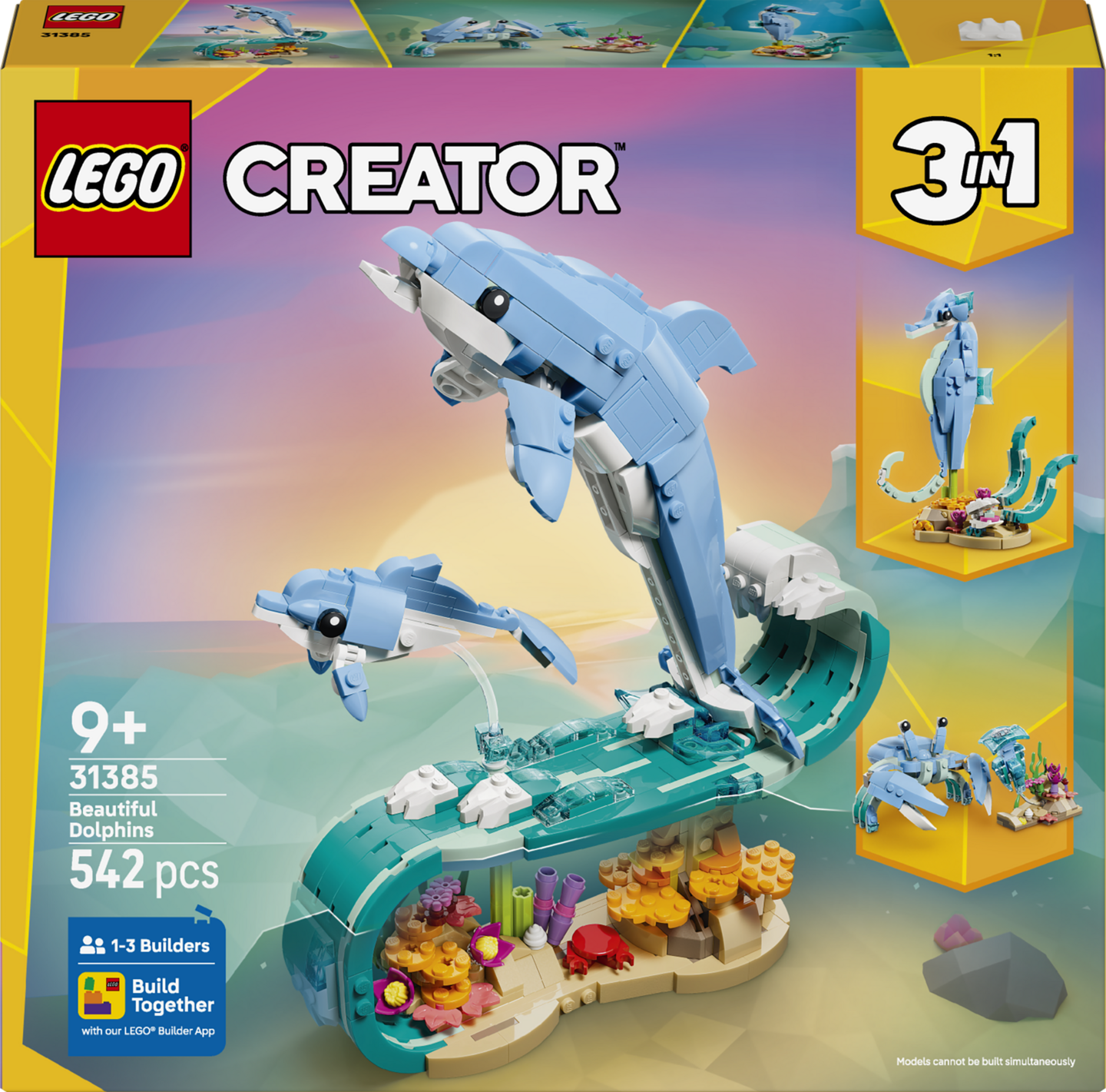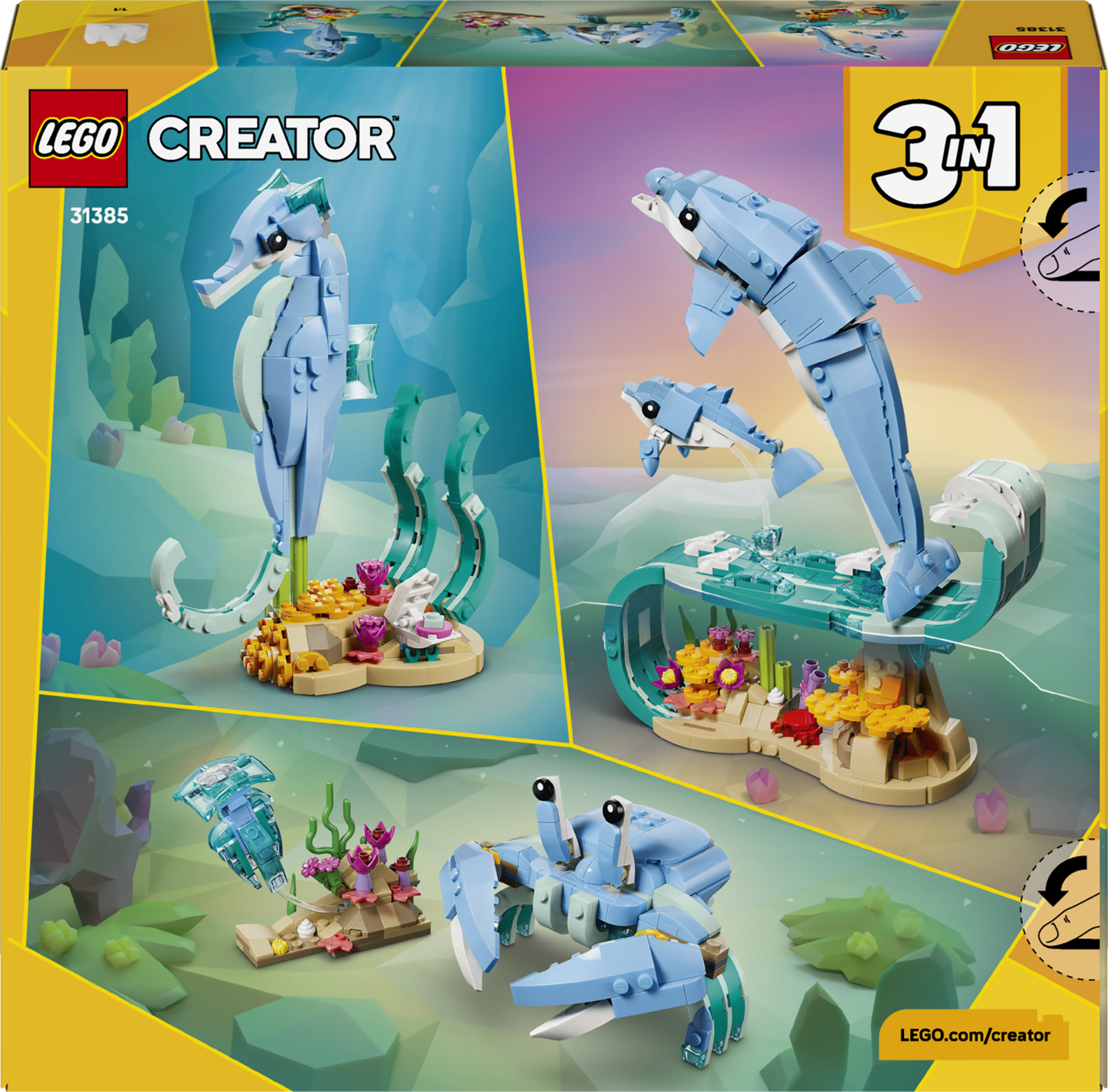 LEGO® Creator 3 in 1 Merieläimet: Söpöt delfiinit (31385) rakennussetti innostaa yli 9-vuotiaat lapset keksimään hauskoja tarinoita. Saman setin palikoista tytöt ja pojat voivat rakentaa 3 erilaista merieläinhahmoa.