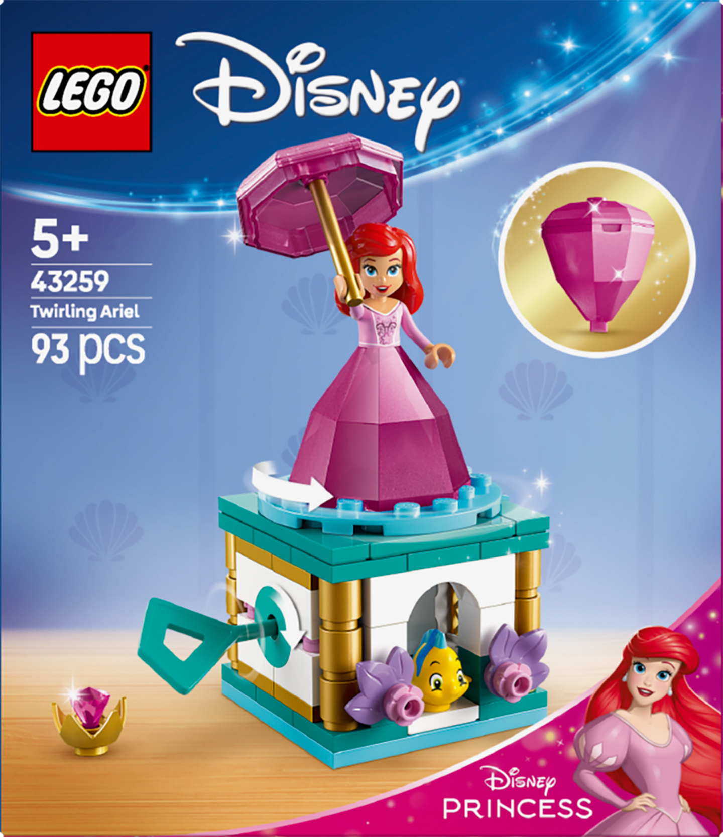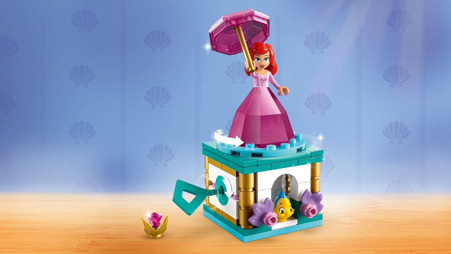 Ilahduta yli 5-vuotiaita lapsia ja Disneyn Pieni merenneito ‑faneja mielikuvitusleikkeihin innostavalla LEGO® ǀ Disney Princess Pyörähtelevä Ariel (43259) rakennussetillä. Lelusetti sisältää jalustan pyörivine rakennuslevyineen, haarukan, avaimen,paikan Pärsky-hahmolle sekä sivuissa olevia timantteja. Timanttipuvusta ja sateenvarjosta voi rakentaa säilytyspaikan Ariel-hahmolle. Rakennettava Disney-pienoismalli on mainio lahja tytöille, pojille ja elokuvafaneille. Hauska rakennelma ja koriste innostaa lyhyisiin leikkeihin vaikka joka päivä.