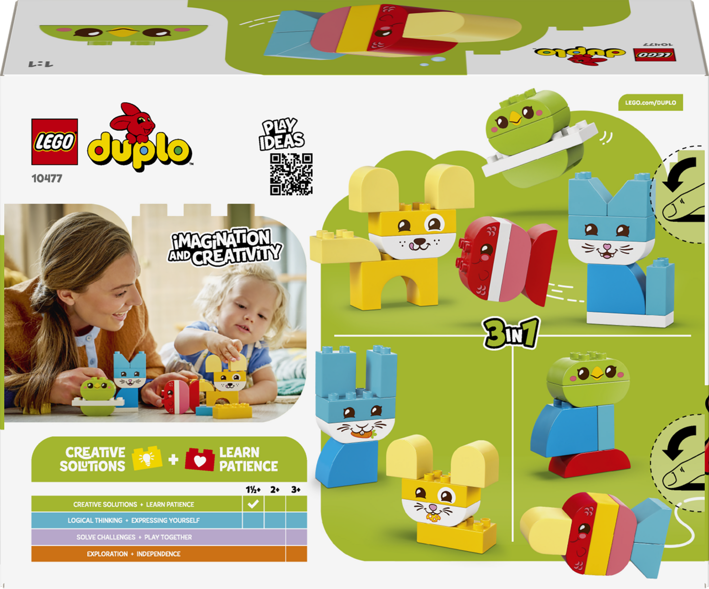 LEGO® DUPLO® Ensimmäinen Söpöt luovat lemmikit 3in1 eläinsetti (10477) tuo leikkituokioihin väriä ja luovuutta. Eläinaiheisen lelun palikoista yli 1,5-vuotiaat tytöt ja pojat voivat rakentaa 8 erilaista eläinhahmoa.