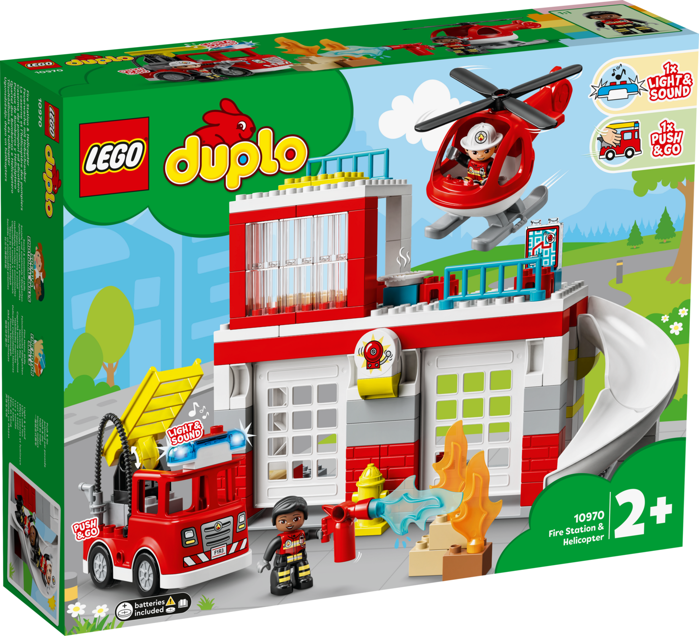 LEGO® DUPLO® Pelastustehtävät: Paloasema ja helikopteri (10970) on huikean monipuolinen leikkisetti, jossa on upeita yksityiskohtia ja jännittäviä toimintoja yli 2-vuotiaiden lasten mielikuvitusleikkeihin.