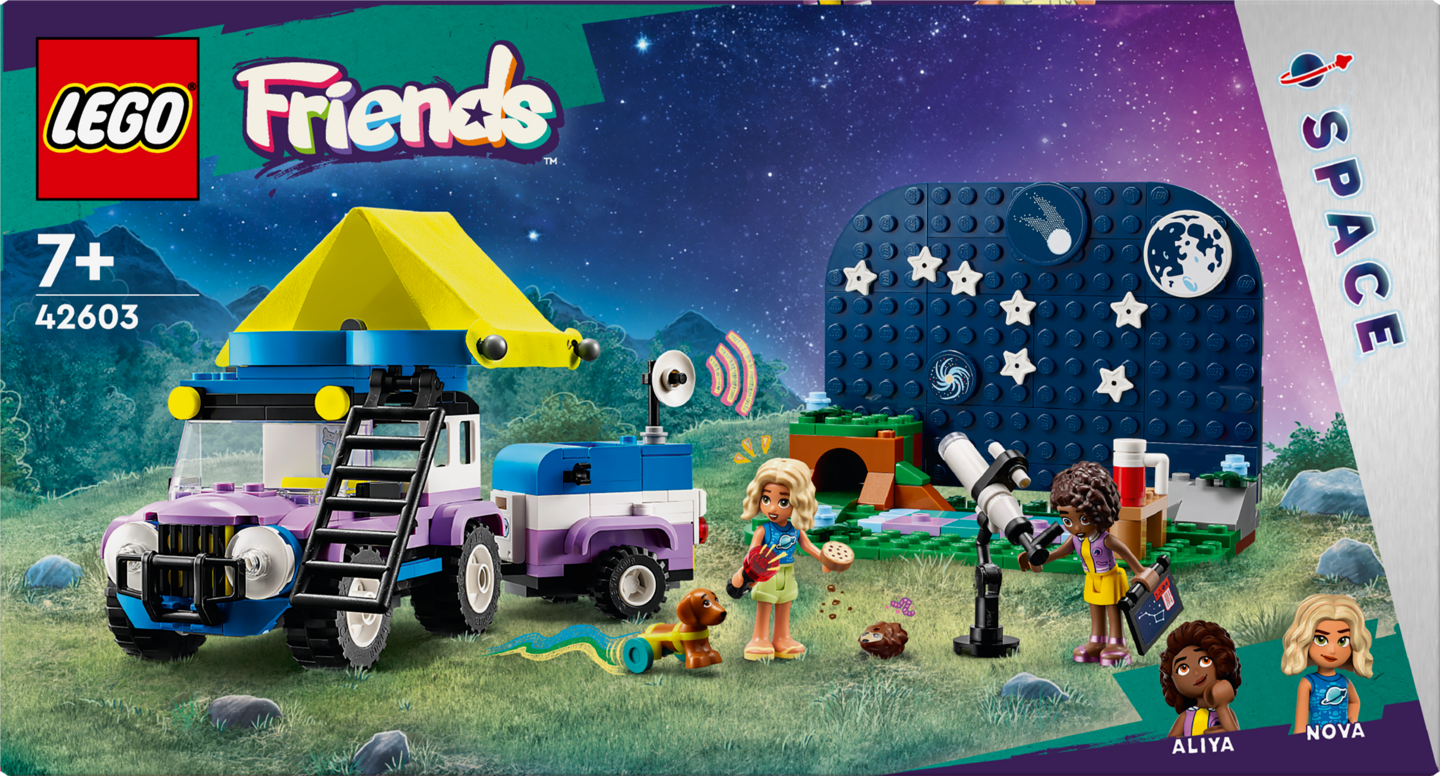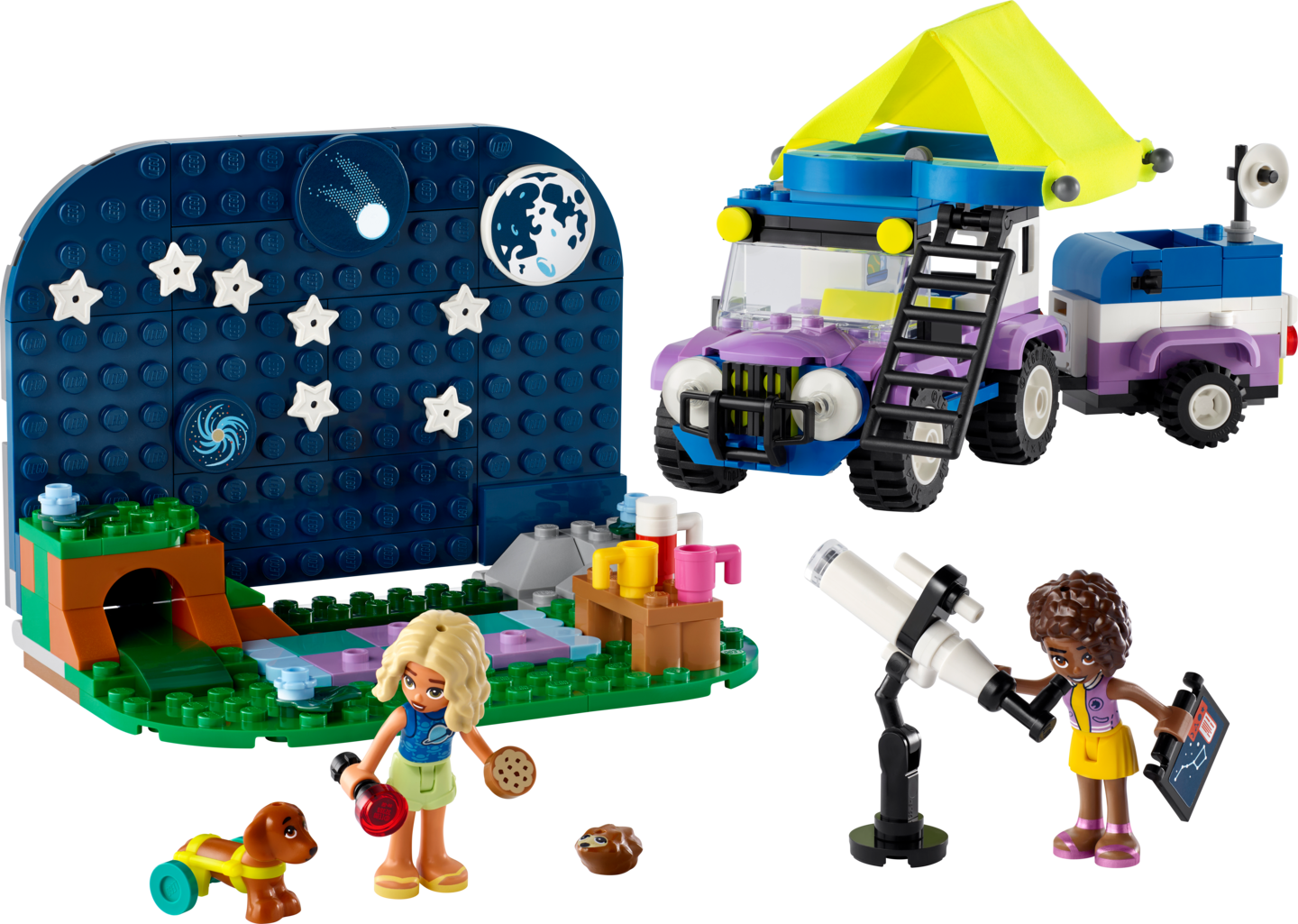 LEGO® Friends Retkeilyauto tähtien katseluun (42603) leikkisetissä riittää yllin kyllin tutkittavaa yli 7-vuotiaille seikkailuleluista pitäville lapsille, tytöille ja pojille. Setti sisältää rakennettavan lelukaukoputken, maasturin perävaunuineen ja taittuvine telttoineen, 2 mininukkea sekä koiran ja siilin hahmot.