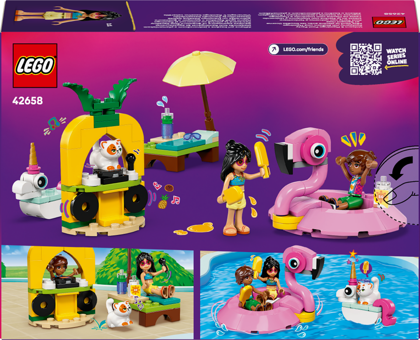 Tämä rakennussetti kutsuu lukemattomiin roolileikkeihin, kun lapset sukeltavat tarinoihin LEGO® Friends Allasbileet – Yksisarvinen ja flamingo (42658) setin parissa. Tämä 5 vuotta täyttäneille tytöille ja pojille tarkoitettu setti sisältää 2 rakennettavaa kelluketta, uima-allastarvikkeita, 2 LEGO Friends mininukkea ja kissahahmon.
