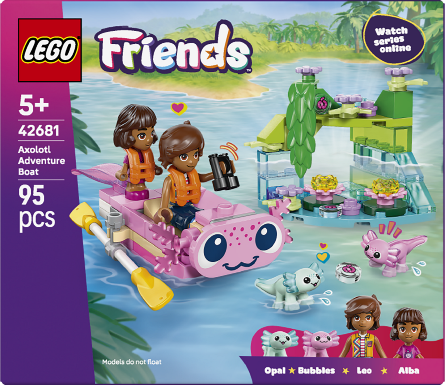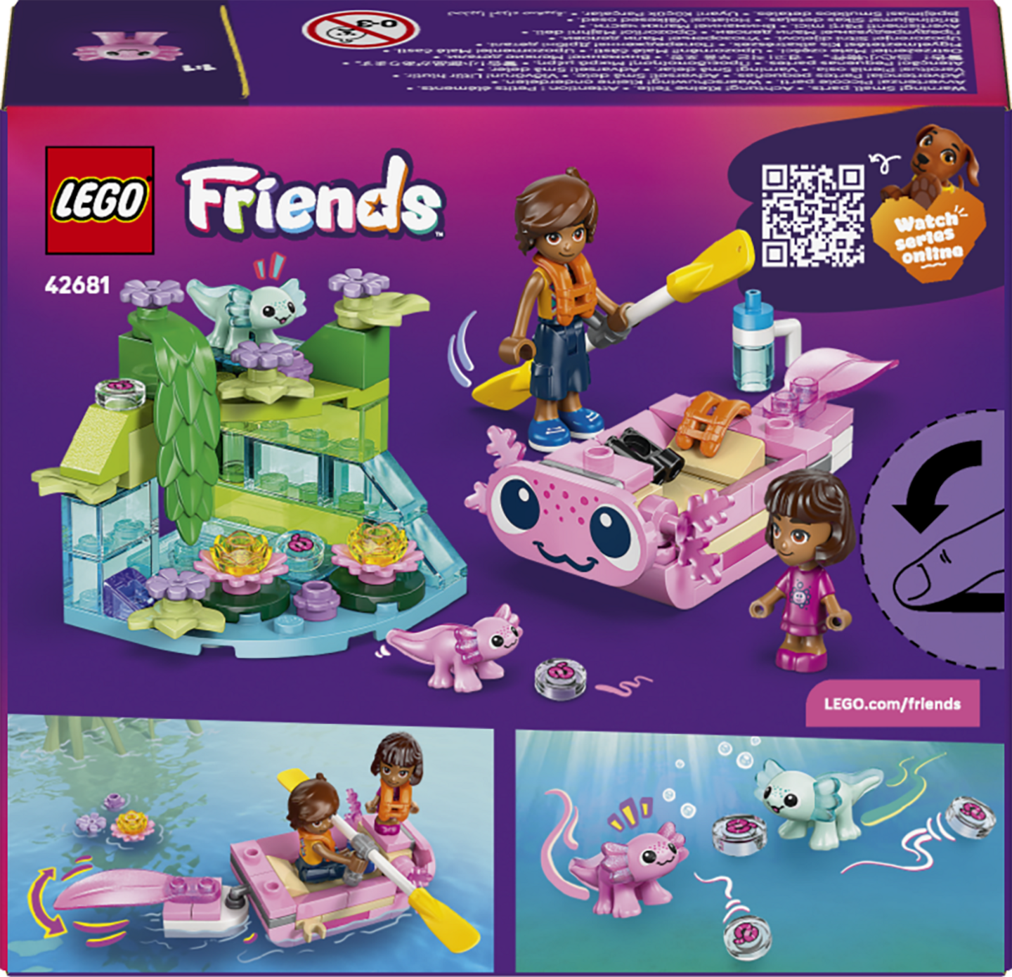 Innosta yli 5-vuotiaita tyttöjä ja poikia hauskoihin tarinoihin LEGO® Friends Aksolotli-seikkailuvene (42681) setillä. Setissä on mukana 1 mininukke, 1 mikronukke, 2 pientä aksolotlihahmoa ja tarvikkeita, jotka innostavat luoviin leikkeihin.