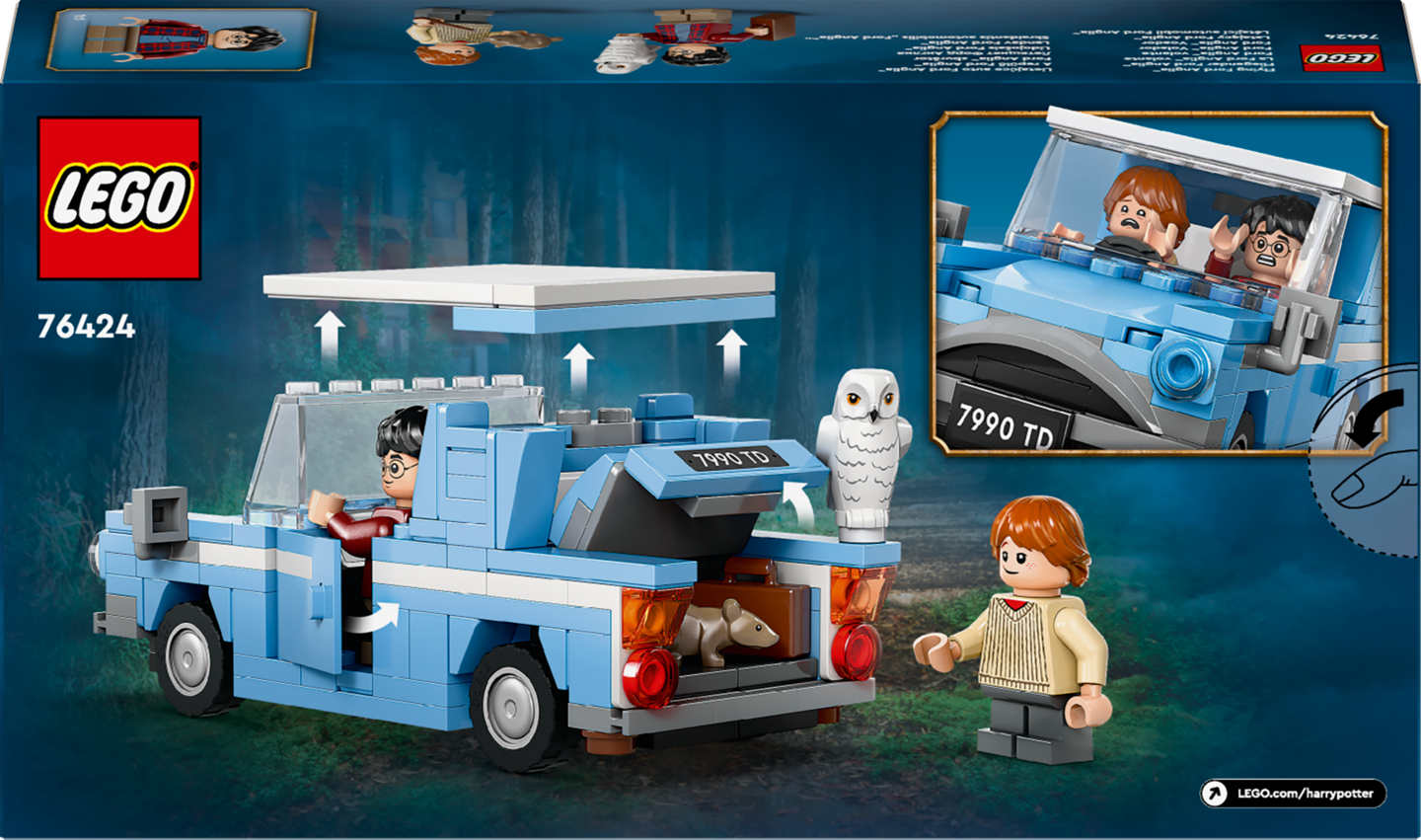 Lentävä Ford Anglia™ ‑setti (76424) innostaa yli 7-vuotiaat lapset Harry Potterin™ ja Ron Weasleyn mukaan jännittävälle matkalle kohti Tylypahkaa. LEGO® palikoista rakennettavassa autossa on avattavat ovet ja irrotettava katto, joten Harry Potterin ja Ron Weasleyn™ minihahmot sekä Hedwig™-pöllön voi helposti laittaa auton kyytiin seikkailujen pyörteissä. Auton takakontissa on myös tilaa matkalaukulle, Harryn ja Ronin taikasauvoille ja Ronin Kutka-lemmikkirotalle.