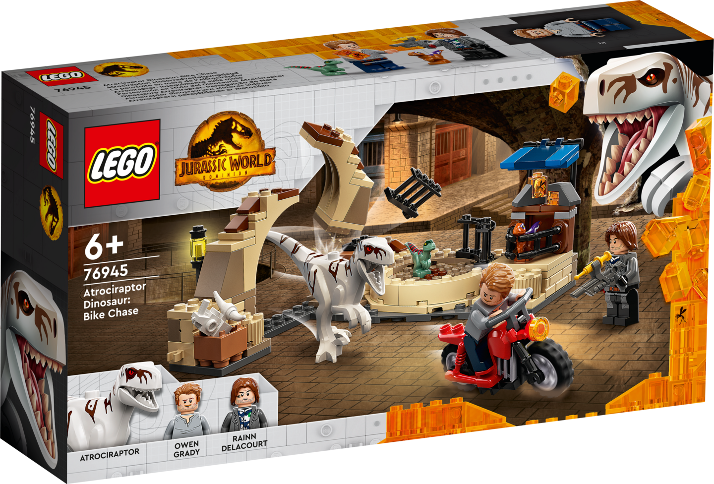 Faneille on luvassa Jurassic World Dominion ‑elokuvasta tuttua jännitystä tämän Atrociraptor-dinosauruksen moottoripyörätakaa-ajo (76945) rakennussetin parissa. Upea yllätyslahja 6vuotta täyttäneille lapsille. Lelusetissä on Atrociraptor-leluhahmo, moottoripyörä, pyörivä dinosaurusten taistelutanner sekä palikoista rakennettava tori, jonka kaadettavat seinät voi rakentaa helposti uudelleen.