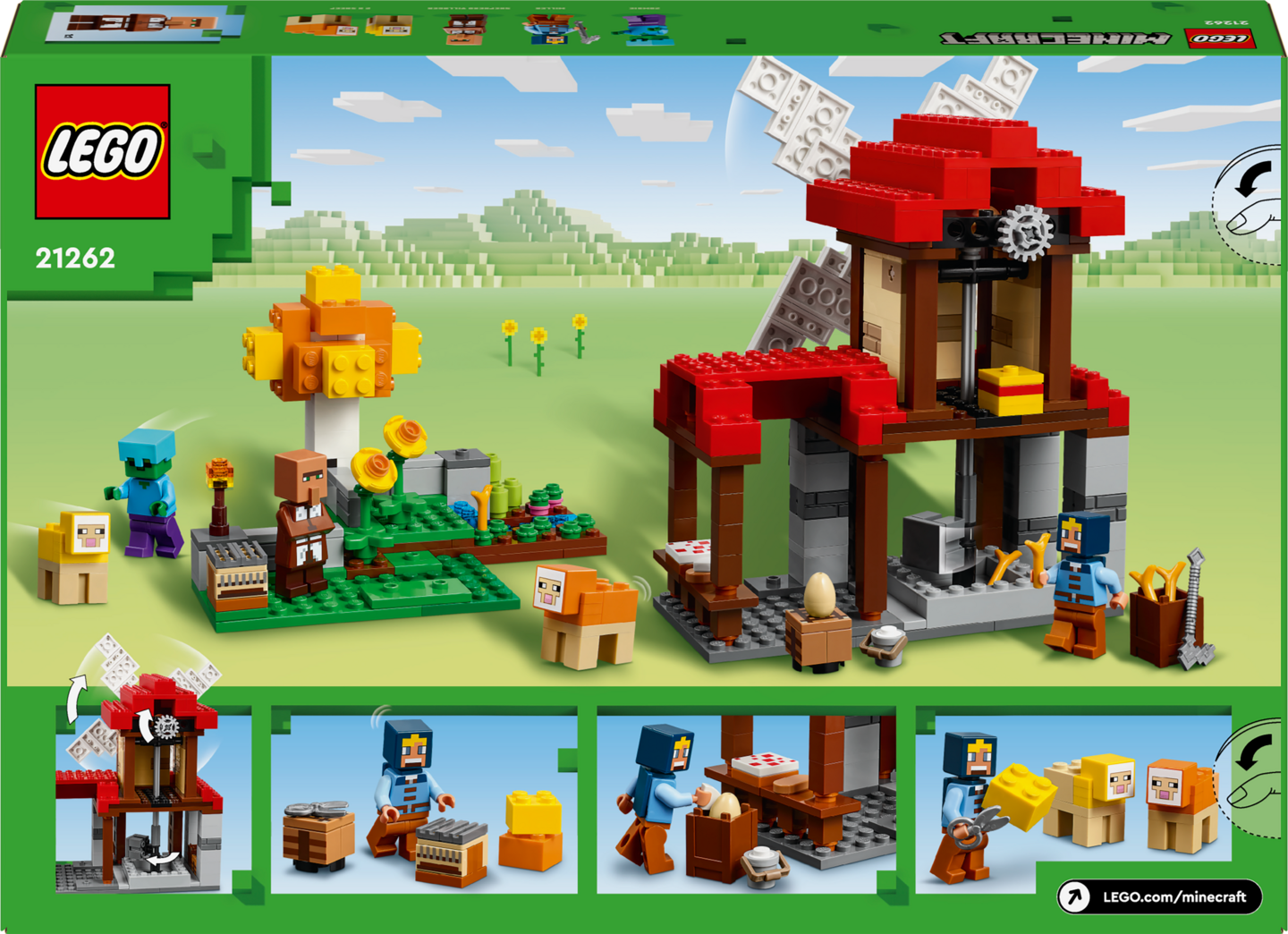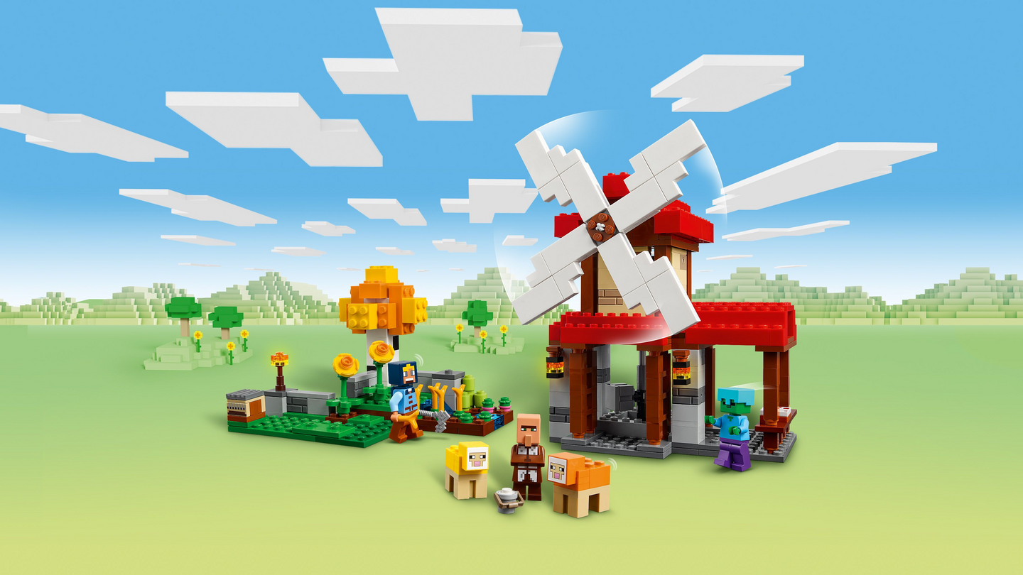 Rakennusleluun kuuluu toimiva LEGO tuulimylly, jota käytetään takaosan pyörää kääntämällä. Myllynkivi pyörii siipien tahtiin aivan kuin vehnästä jauhettaisiin jauhoa. Lapset voivat leipoa leivän ja kakun, sillä tarjolla on myös kananmunia, maitoa ja sokeria. Tuulimyllyn yläosaan voi varastoida heinää ja muita tarvikkeita. Mukana on myllärin hahmo ja paimenkyläläinen, joka keritsee keltaiset ja oranssit Minecraft-lampaat. Tarvikkeisiin kuuluvat myös kangaspuut villoineen, ja lopulla villalla voi koristella puun. Myllyn vieressä on peltotilkku, jossa lapset voivat kasvattaa vehnää, sokeriruokoa ja punajuurta. Zombi vaanii valmiina hyökkäykseen! Digitaalista iloa on luvassa intuitiivisessa LEGO Builder sovelluksessa.
