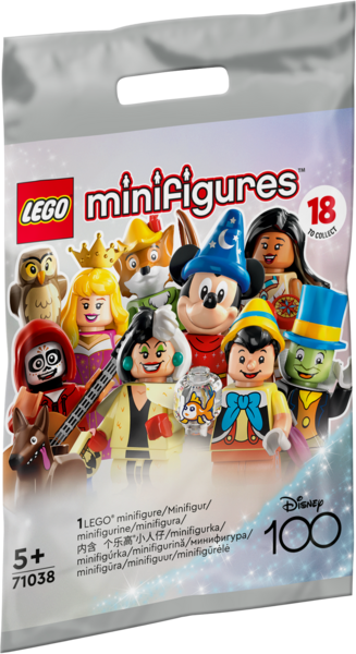 Kaikki 18Disney-hahmojen LEGO minihahmoa on pakattu yllätyspussiin, jossa on mukana vähintään 1hieno tarvike ja keräilijän esite. Täydellinen lahja, joka saa lasten mielikuvituksen lentoon ja joka kruunaa kaikki leikit.