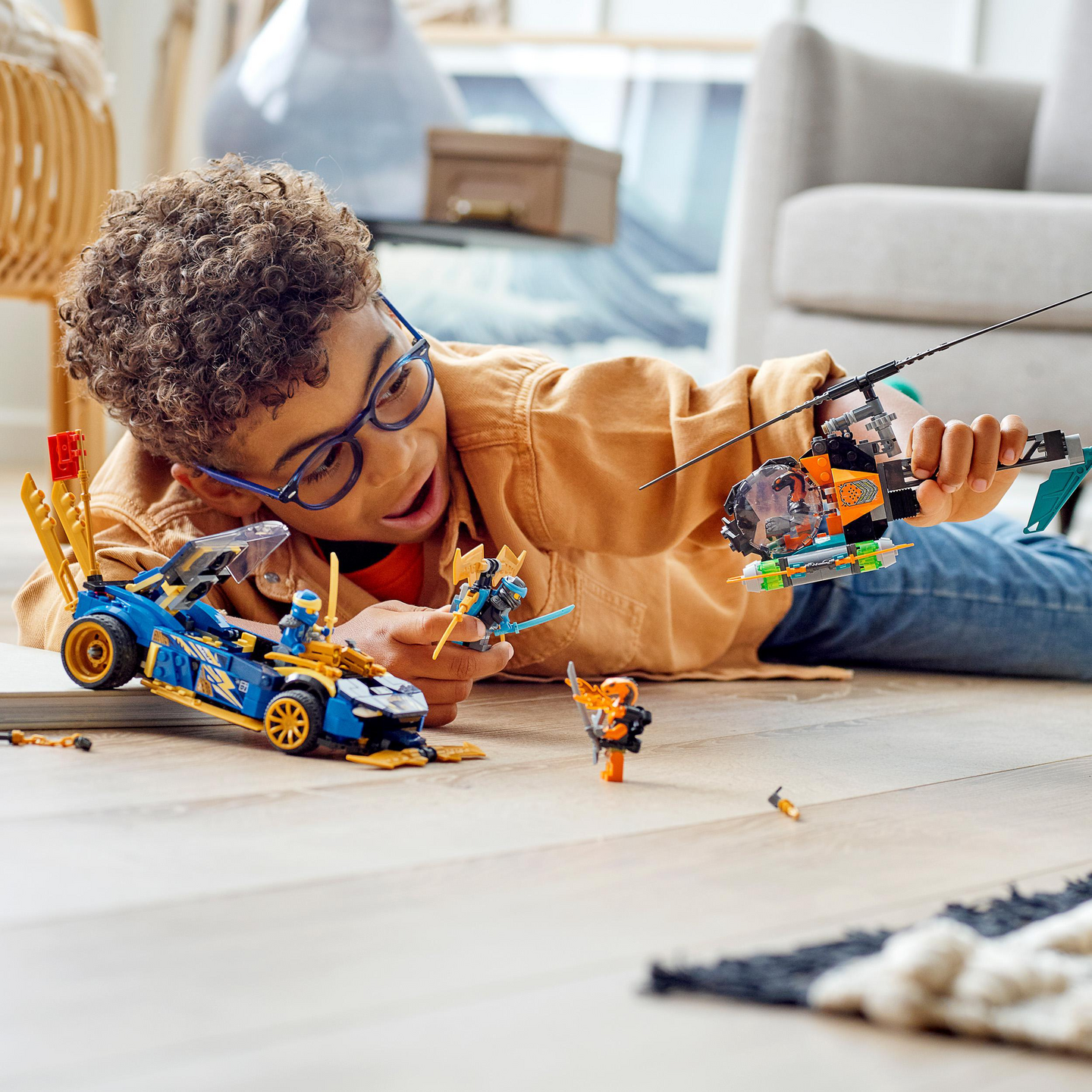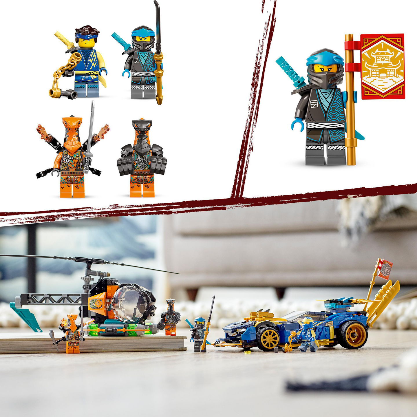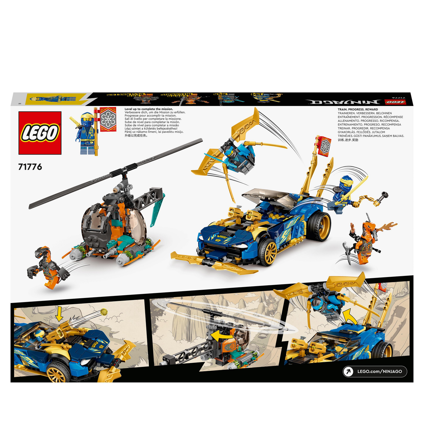 Kiihdytä taisteluun ilkeitä käärmeitä vastaan Jayn ja Nyan parissa heidän uskomattomalla kilpa-autollaan. Varo, yläpuolellasi! Tuhoajaboa lentää panssaroitua helikopteria, ja Mekaanikkokobra on valmis loikkaamaan alas. Irrota lennokki autosta, niin Nya pääsee singahtamaan toimintaan Jayn tulittaessa auton tehokkailla aseilla. Tehtävän suorittamisesta palkitaan Yhteistyö-keräilymerkillä.